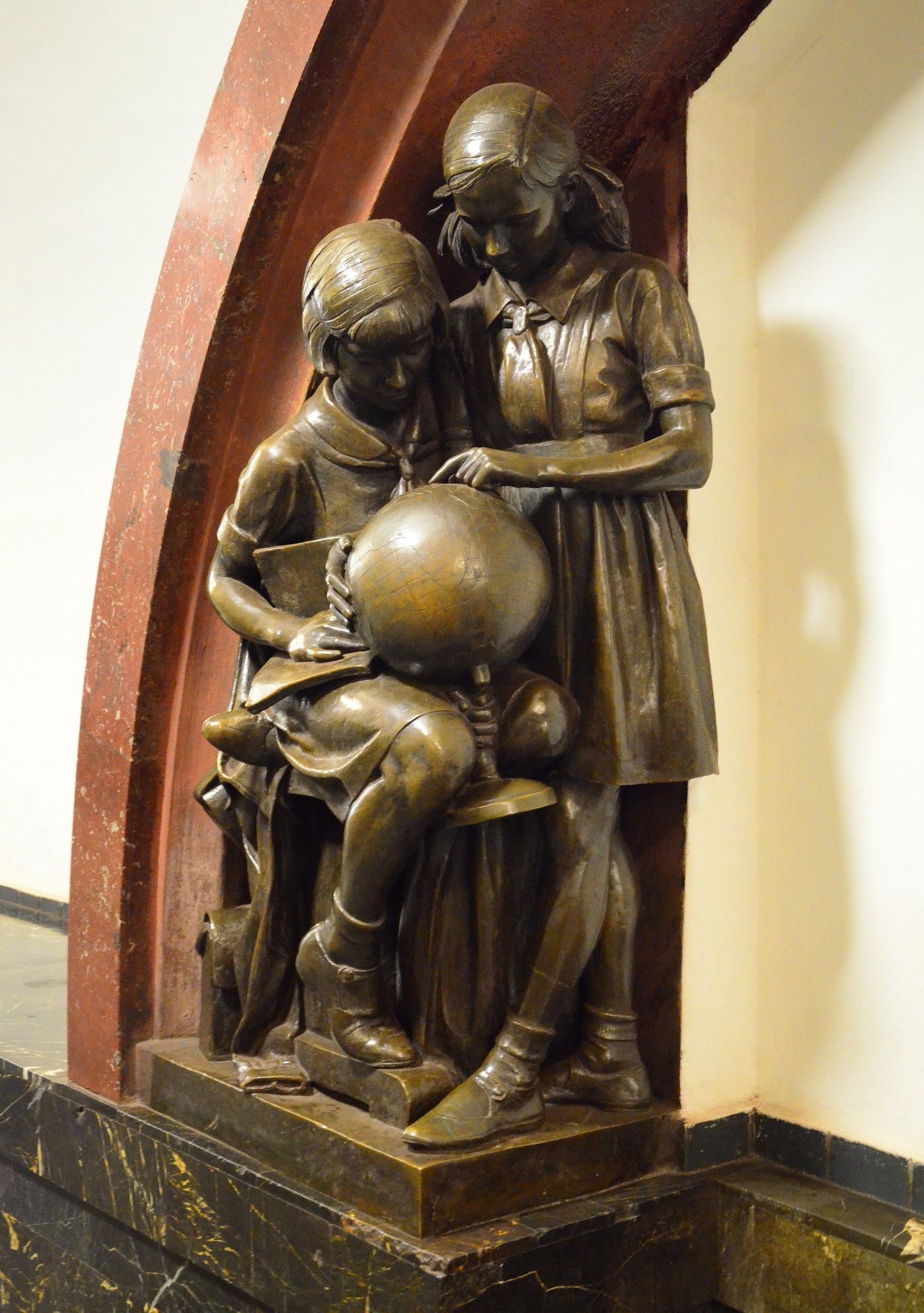 Другая скульптура создана по образу учениц 91-й школы на Новом Арбате - Нина Павлова и Юнесса Лещинская. Интересно, что Матвей Манизер их никогда не видел, а скульптуру сделал по снимку из "Пионерской правды". Девочки увидели себя в метро уже после войны.