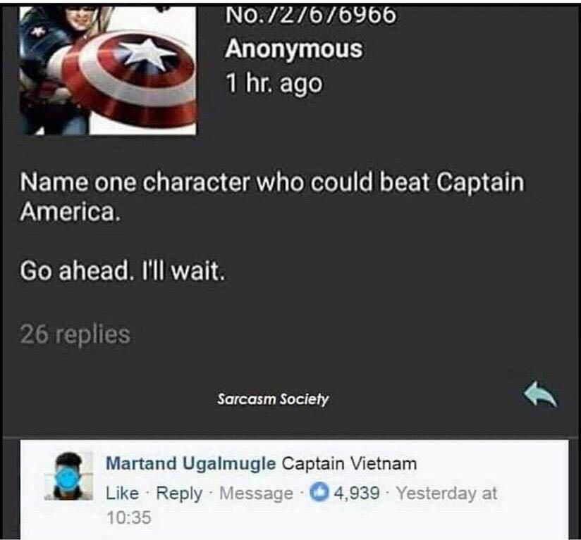 -Назовите хоть одного персонажа, который мог бы побить Капитана Америка. Ну же. Я жду.