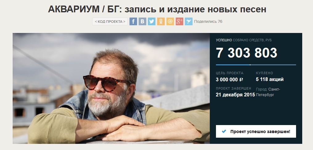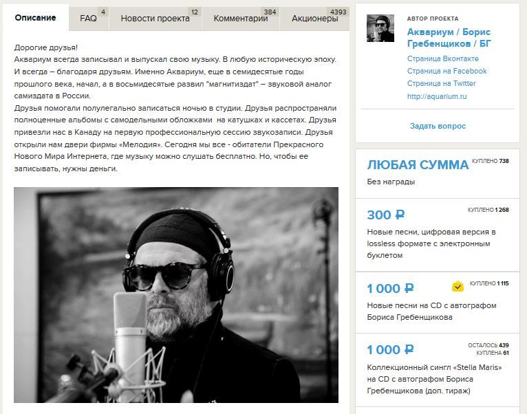 В сентябре прошлого года Борис Гребенщиков разместил проект по сбору денег на новый альбом с помощью краудфандиговой компании планета.ру.