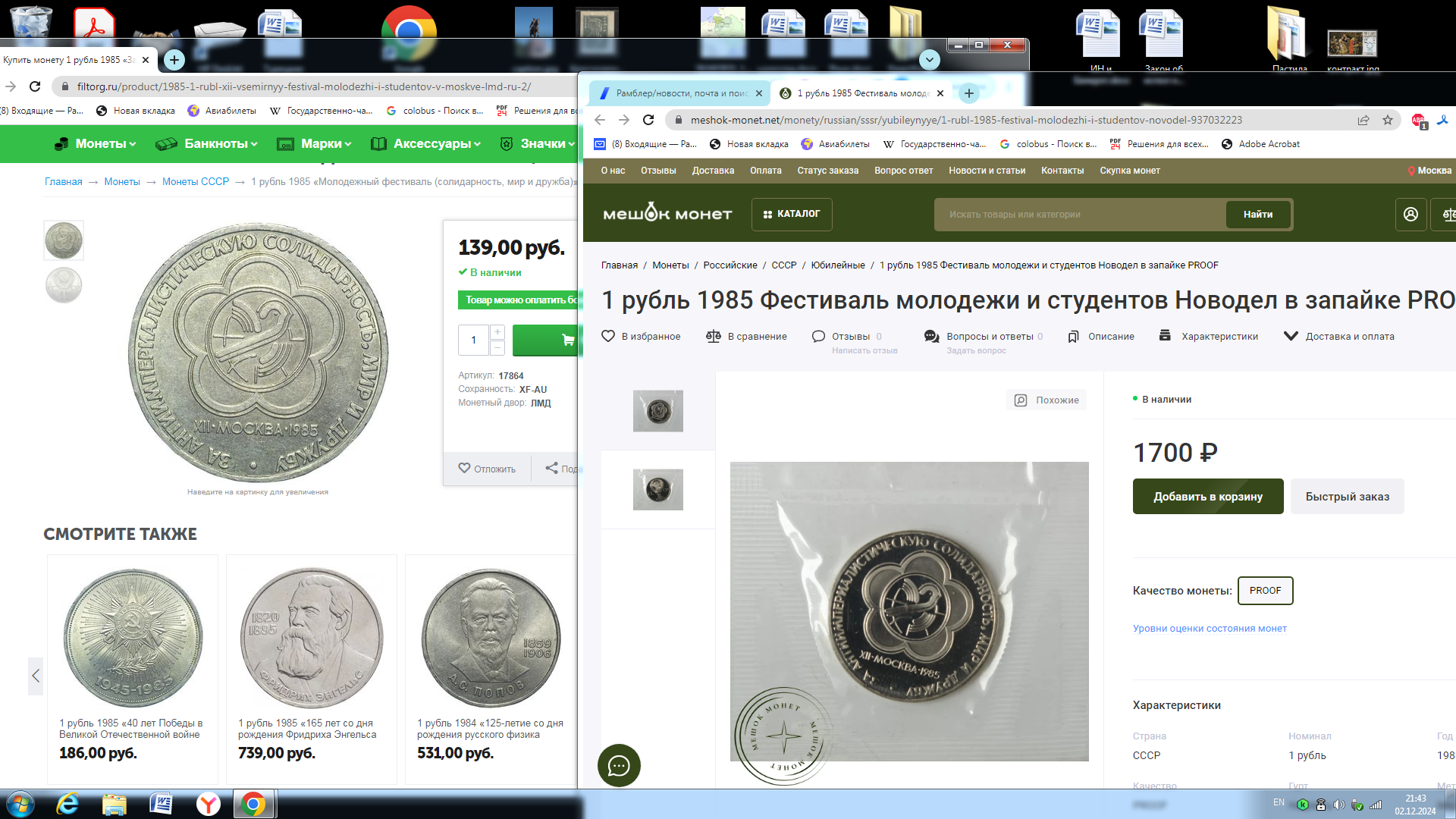 Слева оригинальный рубль 1985 г. в хорошем состоянии. Справа - современный новодел. Разница в цене в десять раз в пользу новодела. Есть и другие примеры, не стану загружать.