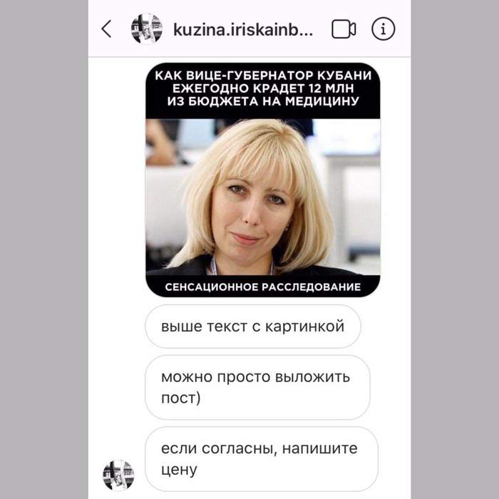 В субботу владельцам краснодарских, сочинских и других местных пабликов написал неизвестный с просьбой опубликовать статью-компромат об Анне Миньковой, вице-губернаторе края. Сама статья якобы уличает чиновницу в коррупции.