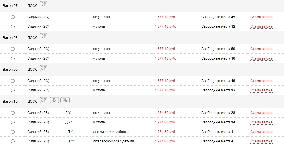 Еще с "Сапсанами" есть такой интересный момент. Обратите внимание, у поезда 745 цена уже 1274 рубля (это в 9:42, почти через два часа после начала продаж). Так вот, если выбрать это поезд, то можно увидеть, что за эти деньги продаётся билет в 10 вагон - это эконом с питанием. А обычный эконом без питания стоит уже 1677 рублей.