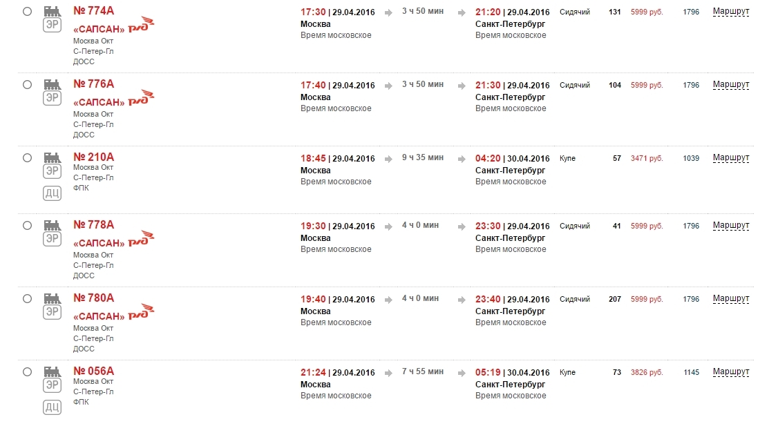 Ну, и напоследок, цены на "Сапсан" Москва - СПб на 29 апреля, пятницу перед майскими: