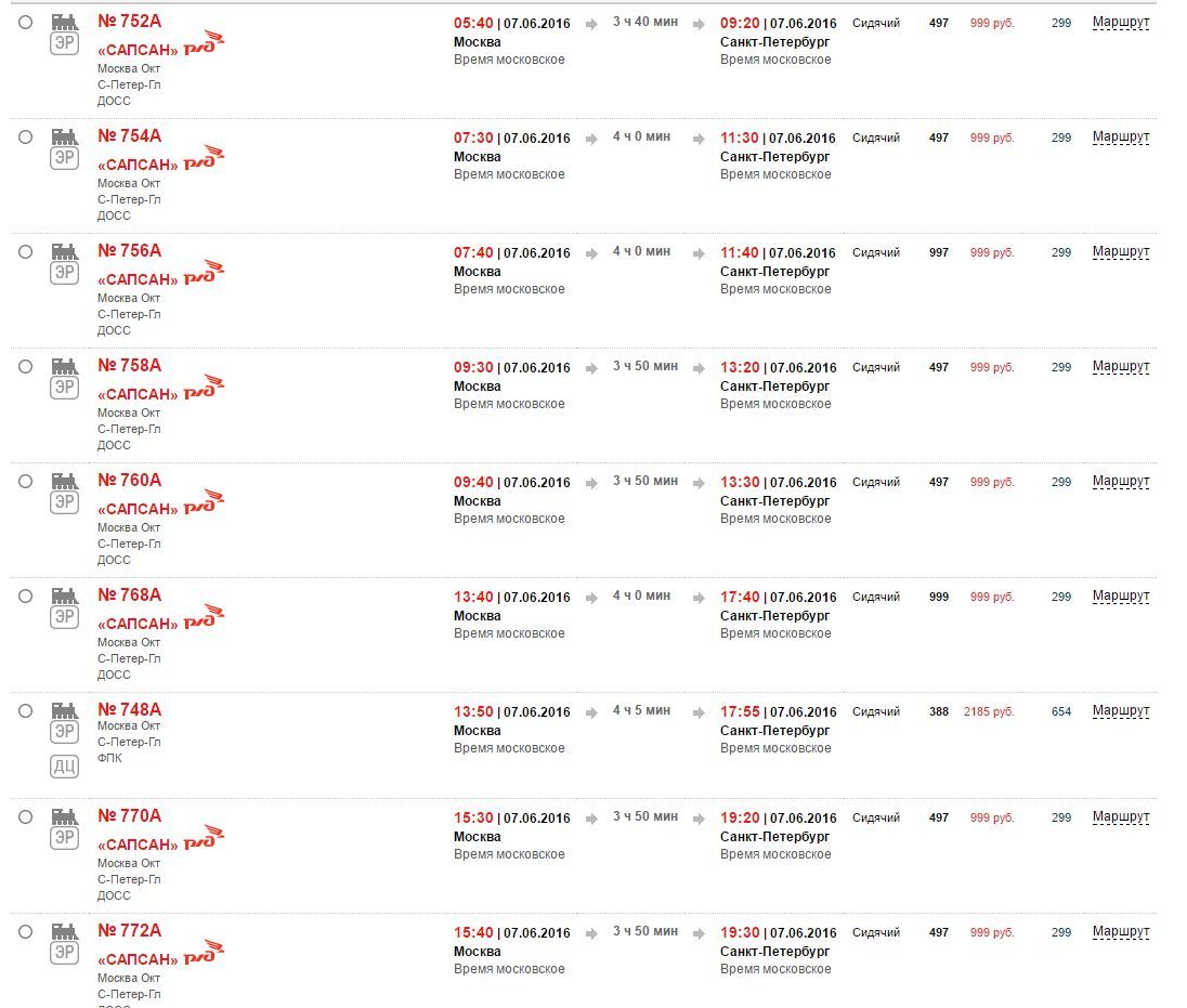 И так, пример того, как оно работает. Сегодня стартовая цена билета на любой "Сапсан" Москва-СПб 999 рублей. Да, это дешевле плацкартного вагона. Вот так выглядел сегодня в 8:00 сайт РЖД при попытке покупки билета на 7 июня (это через 60 дней):
