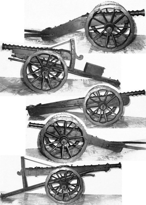 Главным достижением Бургундии в военном деле была ее артиллерия, которая в 1450-70 годах считалась лучшей в Европе. Бургундцы первыми внедрили мобильный полевой лафет, применявшийся с небольшими изменениями в течение нескольких сот лет. На снимке - кованые железные серпентины армии Карла Смелого из различных европейских музеев. Лафеты, скорее всего, новодельные, сделанные по старинным рисункам.