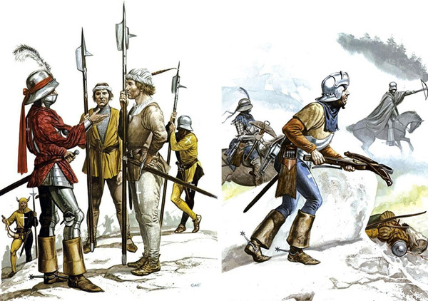 Противники бургундцев - швейцарские алебардисты и арбалетчики.