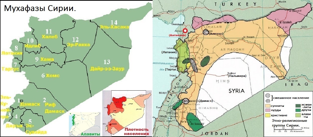это она могла бы требовать возвращения исконных земель греко-сирийцев со столицей их Селевкидского царства, носящей искажённое арабами имя своего основателя - царя Антиоха Великого, турецким городом Антакьей. Но сейчас алавиты в меньшистве, компактно населяя лишь две провинции (мухафазы) Сирии из 14 - Тартус и Латакию..