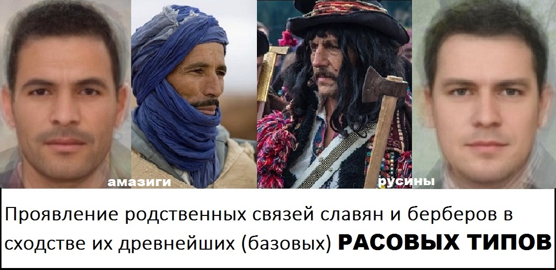 Родственные связи славян и берберов (амазигов) проявляются в сходстве их базовых РАСОВЫХ ТИПОВ. (материал из открытых источников)