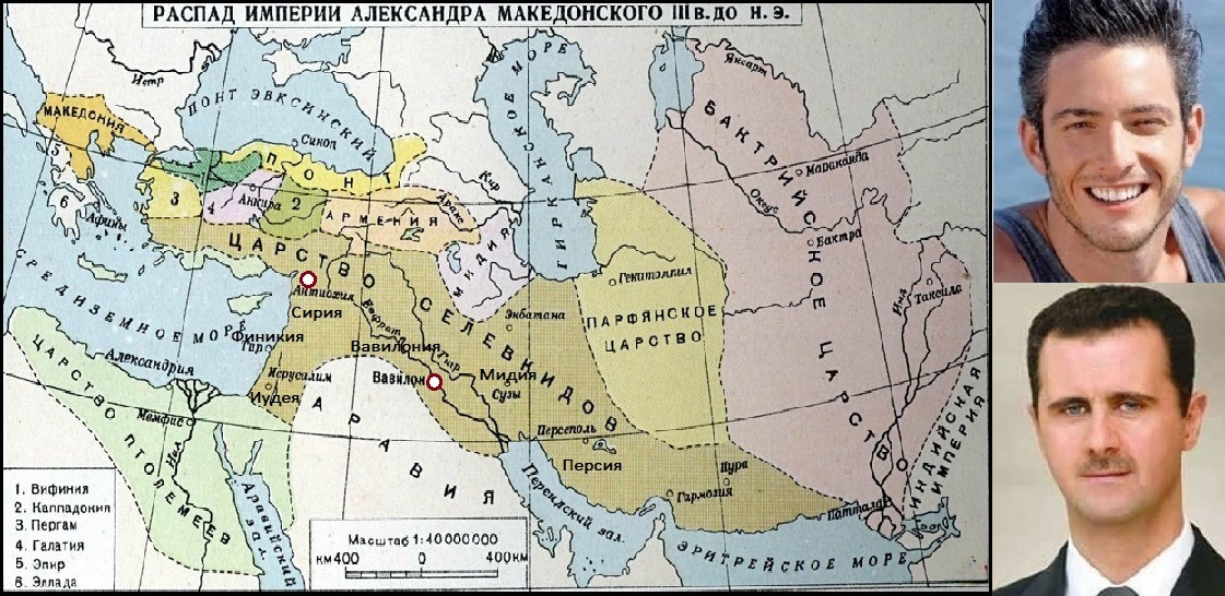 Грек ТЕОХАРИС ИОАННИДИС (вверзу) и сириец БАШАР АСАД: они похожи потому, что у них общие предки. На карте - греко-сирийское ЦАРСТВО СЕЛЕВКИДОВ в 281г до н.э. (материал из открытых источников)