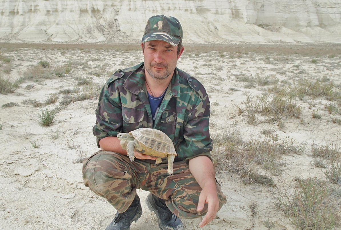С среднеазиатской черепахой (Testudo horsfieldii). Казахстан.