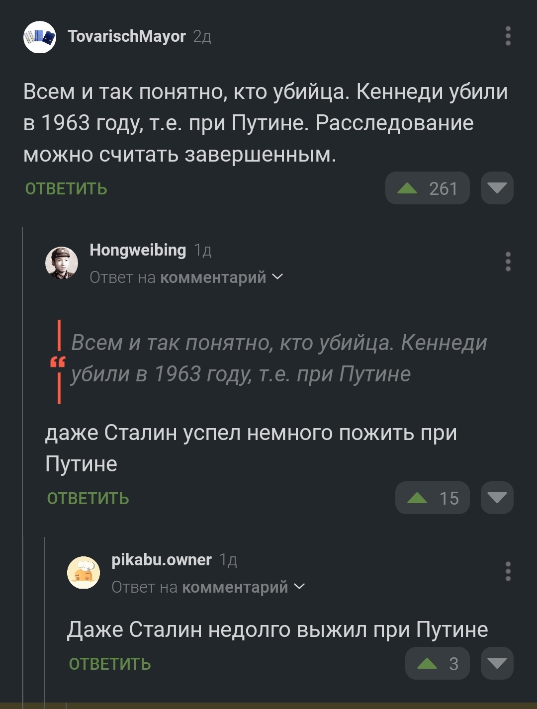 6183 DvDplusKaraokE Политика Кто убил Кеннеди? Выжимка из документов1 10 месяцев назад #comment_344878340 Скриншот Комментарии на Пикабу Юмор Владимир Путин Сталин Убийство Кеннеди Политика 234 6 6 5 Ещё 0