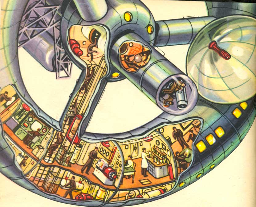 Все эти люди, обслуживающие связную аппаратуру и занимающиеся другими исследованиями, требовали бы достаточного пространства для жизни и работы, производительных систем жизнеобеспечения, запасов кислорода, воды и пищи, - а также врачей и инженеров, управляющих всем этим хозяйством. Сами станции, согласно основной на тот момент парадигме, должны были располагаться на достаточно высокой геостационарной орбите, чтобы постоянно «висеть» над одной и той же точкой земной поверхности, - это упростило бы наблюдения и, в особенности, связь. Масса каждой такой станции могла достигать, в итоге, многих тысяч тонн, заброска которых в космос была бы крайне энергоемким и дорогим удовольствием.