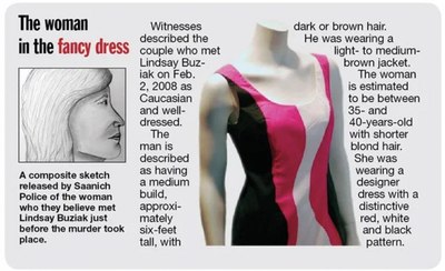 Нашлись свидетели, которые видели Линдси и пару клиентов на подъездной дорожке к дому в 17:30. Женщину описали так: короткие светлые волосы, среднего роста, возраст около 35–40 лет. Главная деталь — яркое платье с красными, белыми и чёрными полосами. О мужчине сообщили следующее: рост выше среднего, тёмные волосы, выглядел довольно обеспеченным.