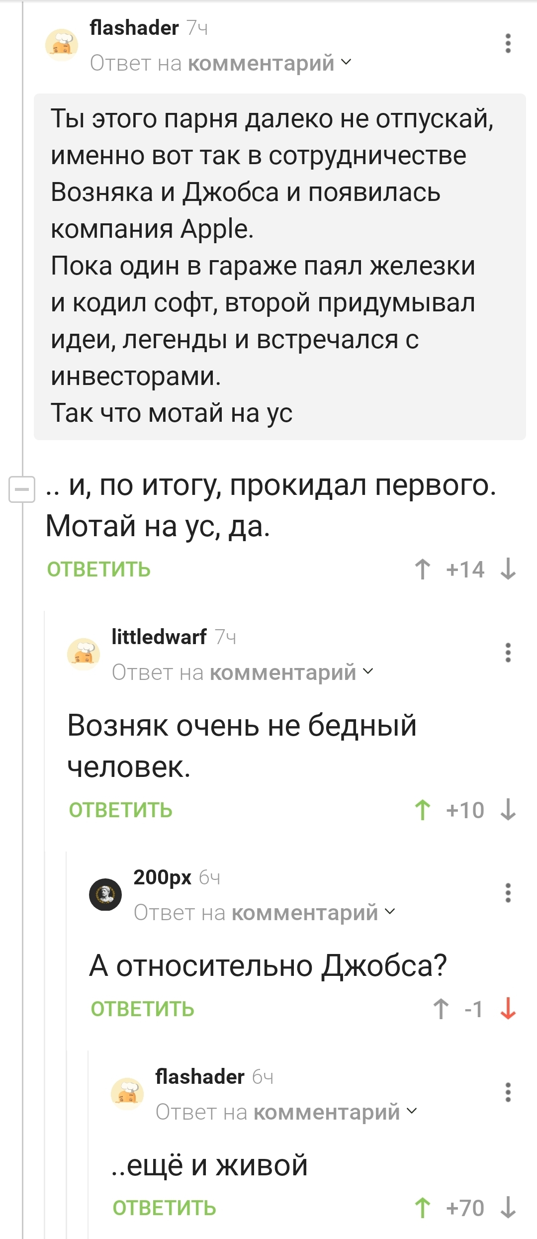 18 Wellikan Кто важнее, разраб или пиарщик? 6 месяцев назад #comment_361934166 Стив Джобс Стив Возняк Длиннопост Скриншот Комментарии на Пикабу 3 1 Ещё 0