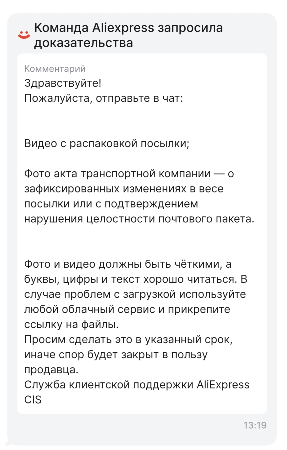 Далее, прекрасно понимая, что создавать спор с Али без видеозаписи дело не особо перспективное, я направился обратно к сотруднику магазина, показав данный ответ, на что он сказал, что ничем помочь не может в данный момент и доступ к записям с видеокамер есть только у “высшего руководства”, и посоветовал все же обратиться в поддержку Алика. Я взял на всякий случай его контактные данные и пошел создавать спор, изложив всю суть, пытаясь ее уместить в 500 символов лимита сообщения. Вот суть: