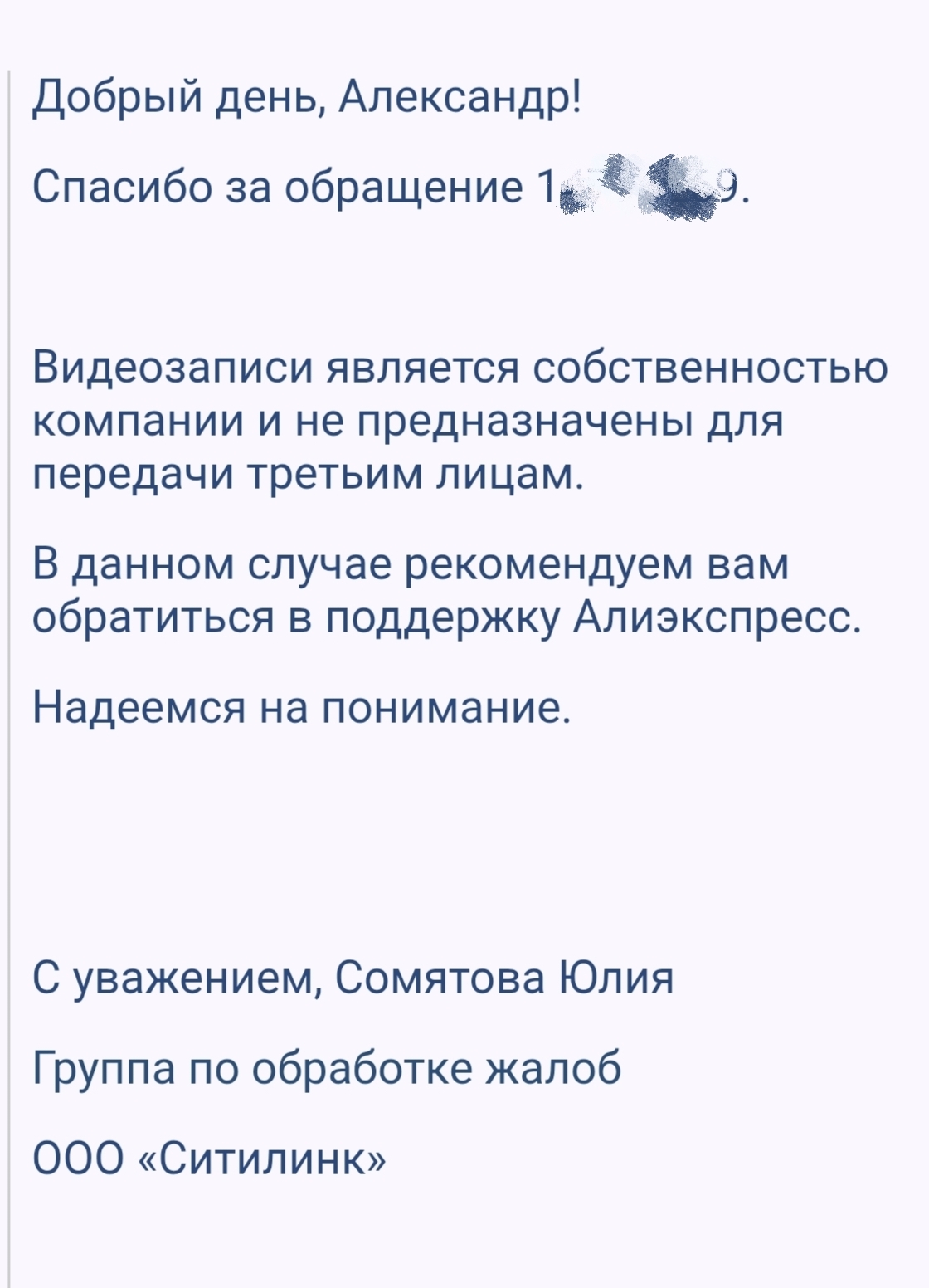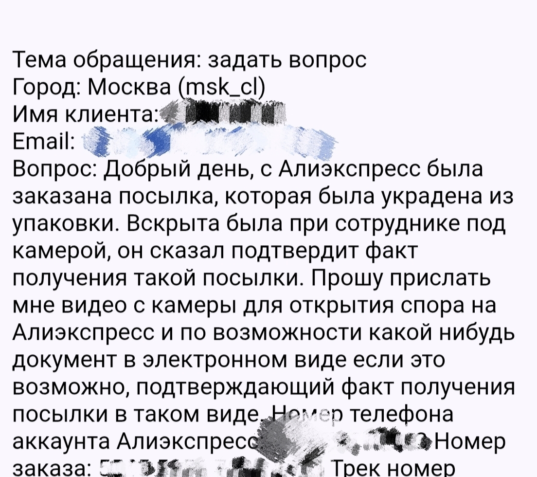 Ситуация следующая: заказал наушники на AliExpress, заказ сделал в постамат, но, видимо, из-за загруженности доставку перекинуло в пункт выдачи Ситилинка в этом же здании. Ну ничего, подумал я, хоть с товарищами из этого магазина стараюсь никаких дел не иметь, после одной покупки видеокарты (впрочем, это совсем другая история). И так, заказ приехал, иду забирать. В пункте выдачи сотрудник пикает штрихкод, идет за моим заказом, и вот долгожданная покупка у меня в руках. Обычно не очень дорогие посылки я просто забираю и дома распаковываю на камеру, но тут меня смутил поврежденный и заклеенный пакет, и я, обратив на это внимание сотрудника, распаковал посылку при нем под их камерой, открыл коробку, и наушников, разумеется, внутри не оказалось. На месте где должен был быть кейс с ними, красовалась тоскливая пустота. Я спросил сотрудника, что мне в итоге делать с данной ситуацией, на что он ответил, что никаких проблем нет, обратитесь в поддержку ситилинка и они предоставят вам видеозапись с получением для спора с Али и что если что, то он подтвердит им, что все так и было. Ну ок, подумал я, бывает, хотя это первая кража посылки у меня, но неприятненько. Дома написал в поддержку Ситилинка свой мыслепоток и отправил заявку со следующим содержанием: