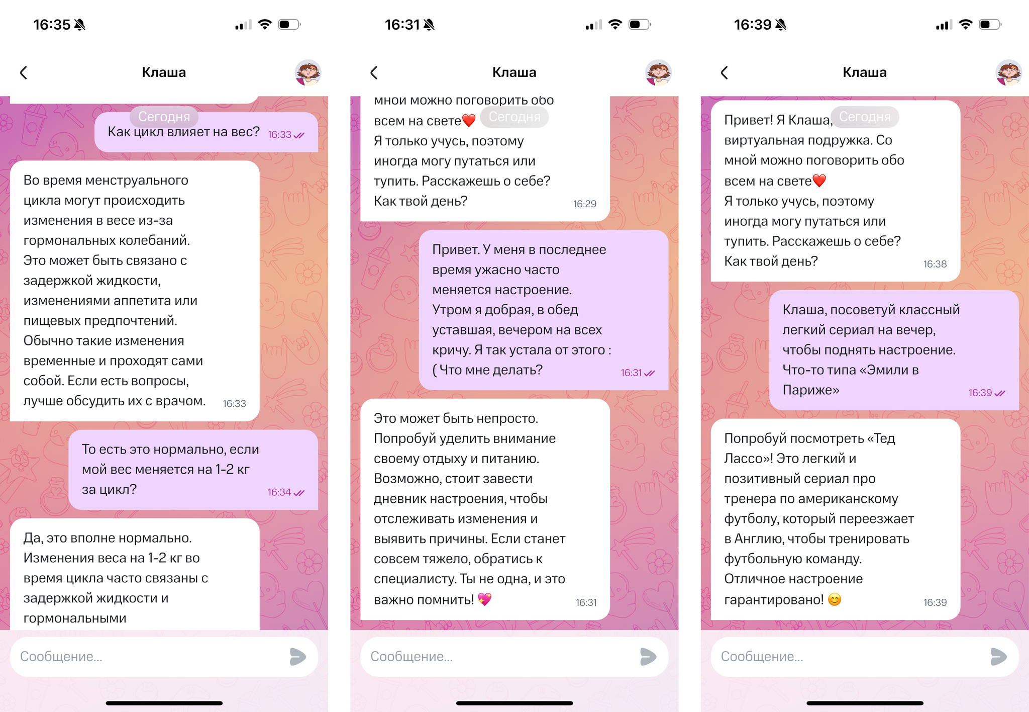 А потом дело за технической стороной: Клаша обращается к базе данных из частых вопросов от пользователей и подготовленных ответов. В качестве такой базы мы используем LLM (большую языковую модель) с адаптацией под нашу тематику. Все ответы заранее верифицированы психологом, поэтому даже на самые сложные темы Клаша отвечает профессионально и поддерживающе.