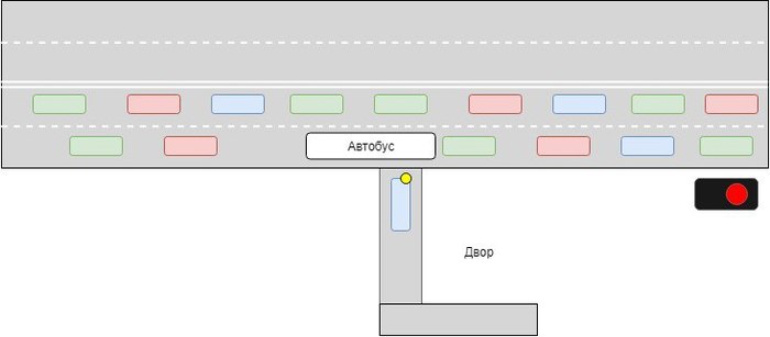 2. Выезжаю со двора, на дороге стоит пробка в ожидании светофора. Но мне повезло, в месте выезда есть пространство, куда можно выехать и начать движение вместе с потоком.