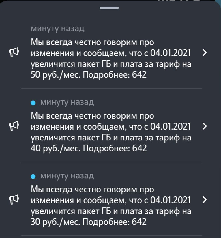 Теле2 начал слать одно за одним уведомление о повышении абонентской платы за тариф. Начали с 30 рублей, пока остановились на 50 (уведомления в порядке снизу -> вверх). Горшочек не вари