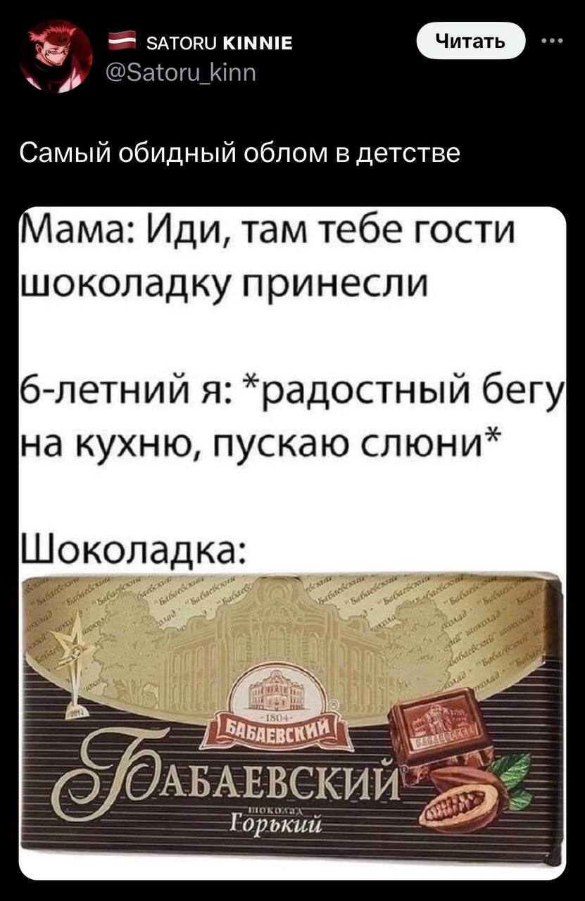 30 liontignyh Юмор для всех и каждого Юмор Кто-то такой шоколад вообще любит? 7 месяцев назад Юмор Скриншот Картинка с текстом Диалог Шоколад Анекдот X (Twitter) 4 1 Ещё 0
