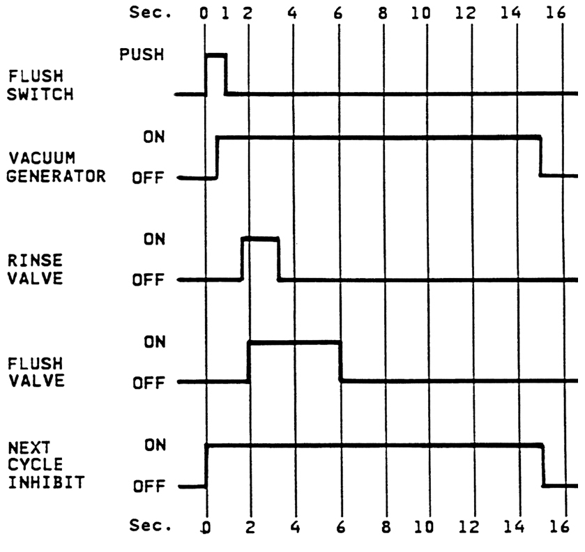 Где-то через секунду, как начал работать вакуумный генератор, открывается клапан подачи воды и в чашу унитаза впрыскивается небольшая порция воды. Её правда подается мало, буквально секундный «пшик». И почти одновременно, но все же чуть-чуть позже, открывается клапан смыва. На этот момент, прошло всего 2 секунды после того, как вы нажали кнопку смыва. К этому времени в баке вакуумник уже создал достаточное пониженное давление, поэтому все, в прямом смысле слова, со свистом улетает в трубу. Поэтому, если вы пользовались туалетом в самолете, наверняка, слышали громкое пугающее шипение. Клапан смыва держится открытым всего 4 секунды, но это вполне хватает, чтобы пропустить через себя даже ведро воды. На шестую секунду с момента нажатия на кнопку смыва клапан смыва закрывается, но вакуумник продолжает работать ещё 9 секунд. Пока вся пятнадцатисекундная циклограмма не завершится повторный смыв процвести не получится. Оригинальная циклограмма приведена ниже, переводить не стал.