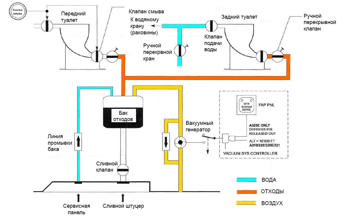 Разберем работу системы отходов из сортира на примере нашего любимого А320. На остальных самолетах этого класса и эпохи принцип аналогичен.