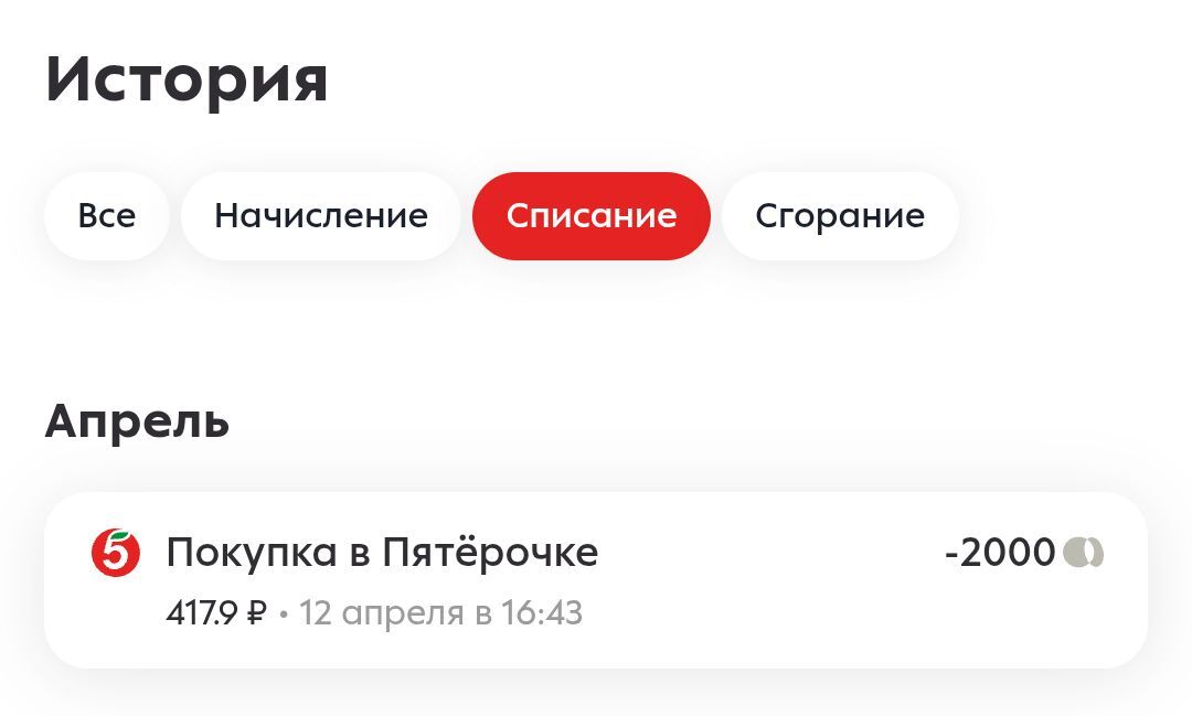 Списываю баллы раз в 2-3 месяца, чтоб не произошло сгорания. Последнее списание производил 12.04.2025 в количестве 2000 баллов, какое-то количество осталось.
