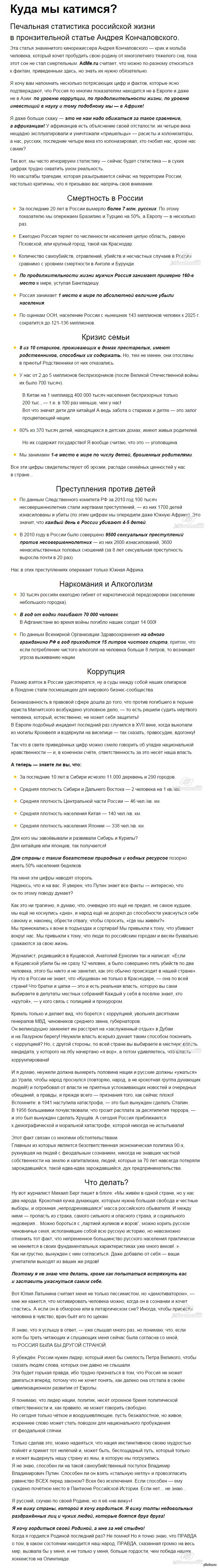 Forvard77 Куда мы катимся? Статья Андрея Кончаловского. 11 лет назад Длиннопост Россия Статистика Андрей Кончаловский ADME Политика Задумайтесь
