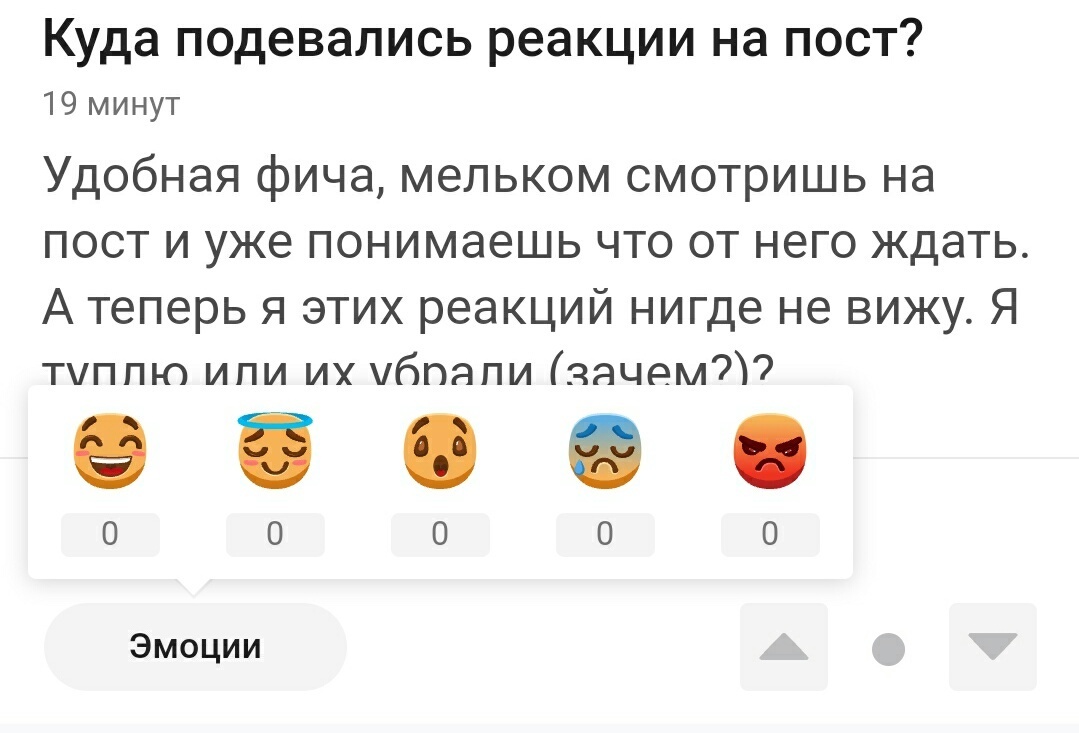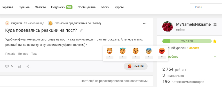 2 Guguitar Отзывы и предложения по Пикабу Куда подевались реакции на пост? 2 года назад Удобная фича, мельком смотришь на пост и уже понимаешь что от него ждать. А теперь я этих реакций нигде не вижу. Я туплю или их убрали (зачем?)? Пикабу Вопрос Текст 3 1 1 1 Ещё 0