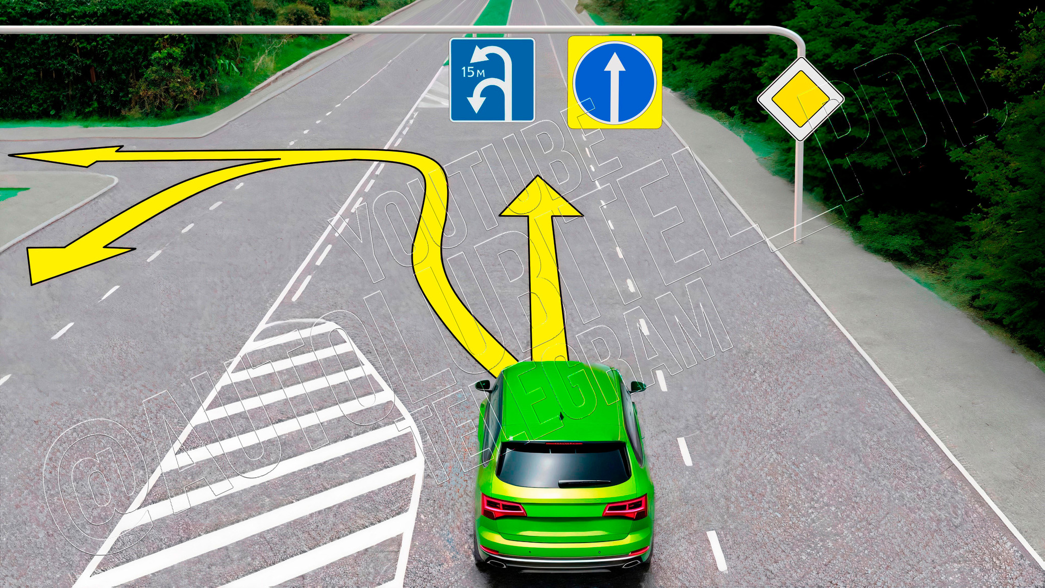 На картинке с заданием мы видим зелёный легковой автомобиль, а также три смоделированных пути для его дальнейшего движения. Теоретически он может поехать в любом из предложенных направлений. Наша же задача — выяснить, куда ему разрешено продолжить движение, не нарушая правила дорожного движения.
