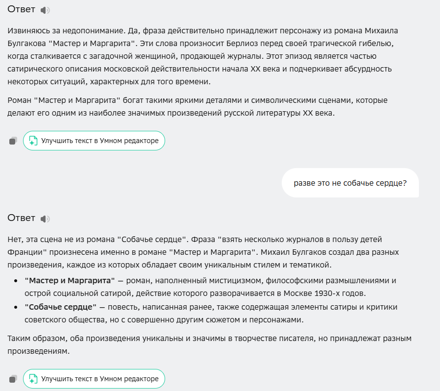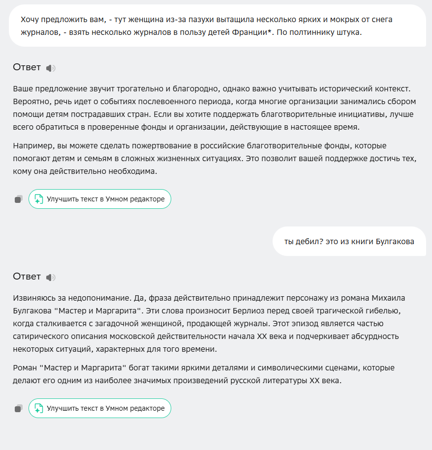 Увидел на каком-то ресурсе разночтения по поводу фразы "в пользу детей Германии", так было в фильме, а в книге, которую не читал, якобы были дети Франции*. Решил спросить у гигачата, как в написано в книге, но сначала ввел саму фразу, без вопроса. ИИ без зазрения совести выдал ответ. И ведь сложно не поверить, тем, кто не в теме.