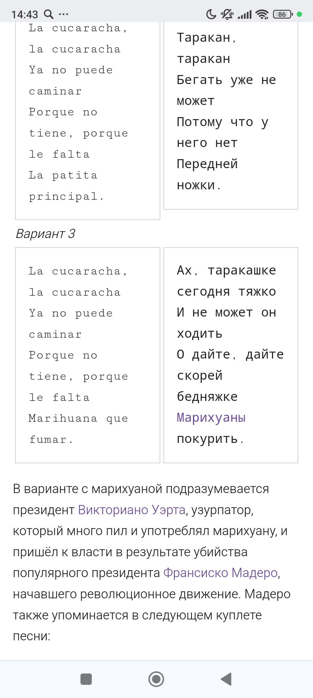 15 alekseysherstnev Лига дезинфекторов Кукарача 1 год назад 1 из вариантов перевода песни Ла кукарача звучит так как написано Википедии (фото сверху).Очень смешной и одновременно странноватый текст. [моё] Кукарача Тараканы Песня Длиннопост 2 Ещё 0
