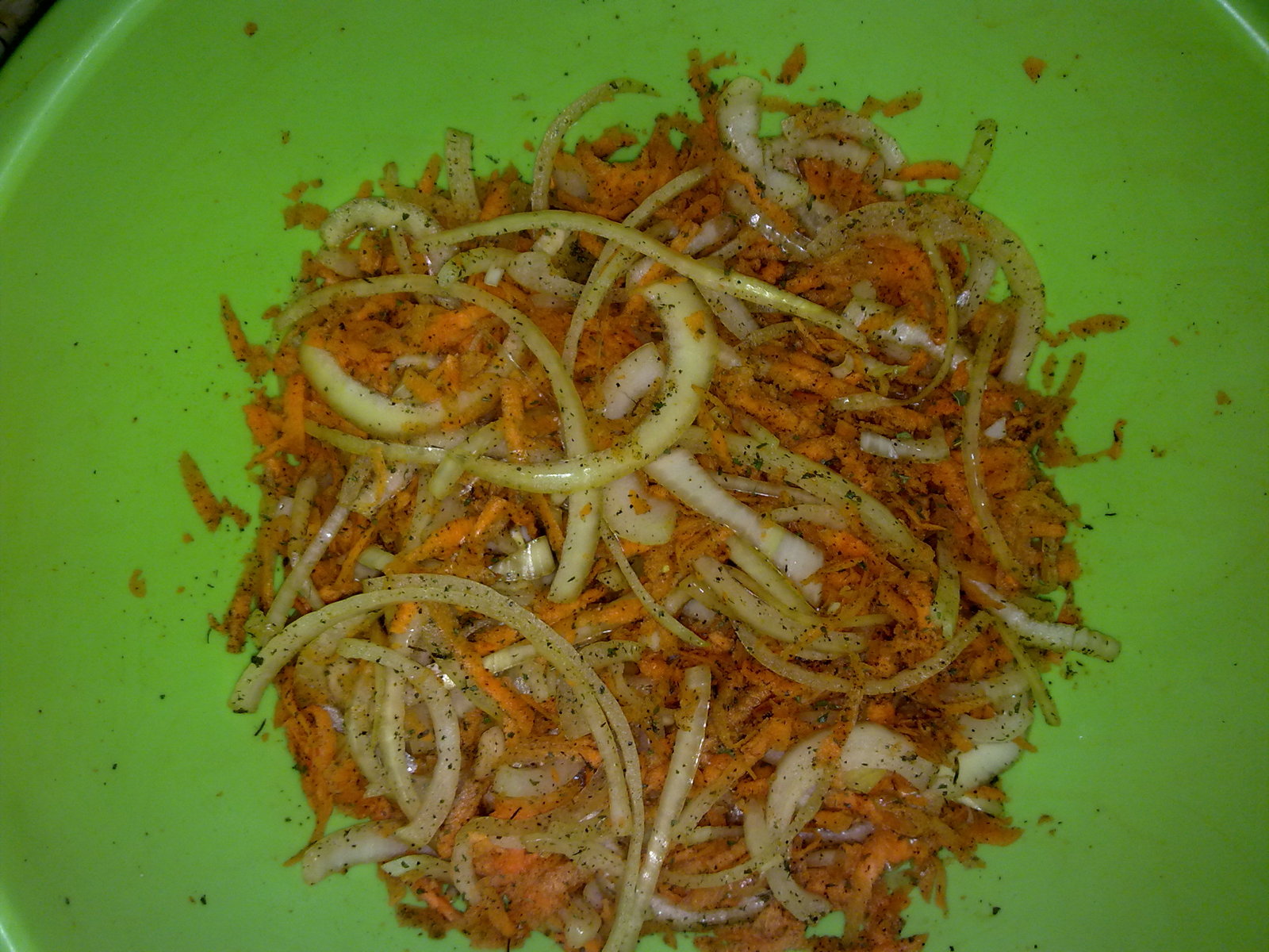 Тем временем готовим овощи. Они не замысловатые. Луковицу режем полукольцами, морковь трем на крупной терке. Добавляем по вкусу соль, черный перец, перец горошком, лавровый лист, куркуму, и все специи, какие только вам нравятся. Я добавил еще сушеную (лично) мяту.