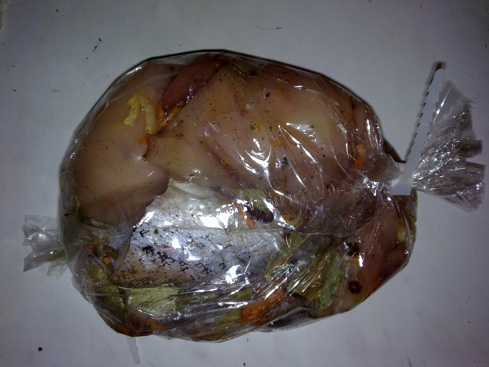 Сейчас собрался сделать кальмара, фаршированного овощами, в рукаве. Но, под балконной дверью, на холоду, рядом с кальмарами скучали три, уже размороженных, безвинно убиенных минтая. Готовить их порознь, конечно лень. Придумал рецепт.