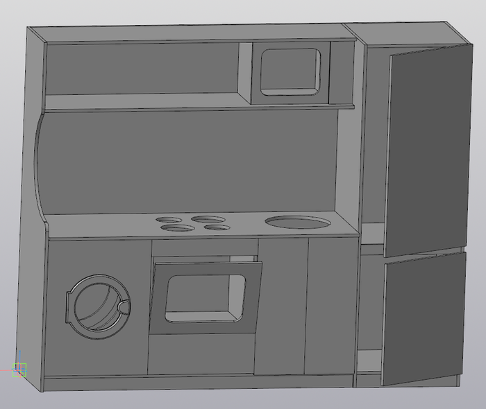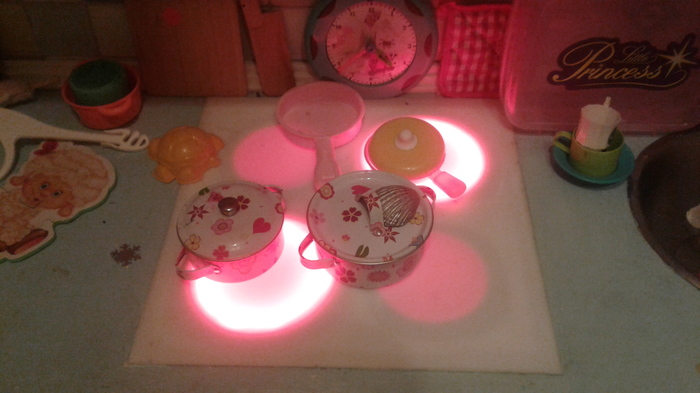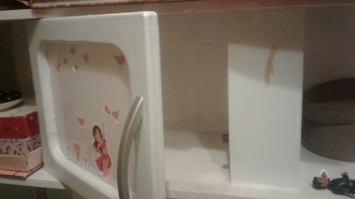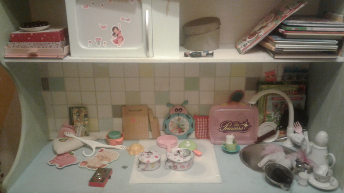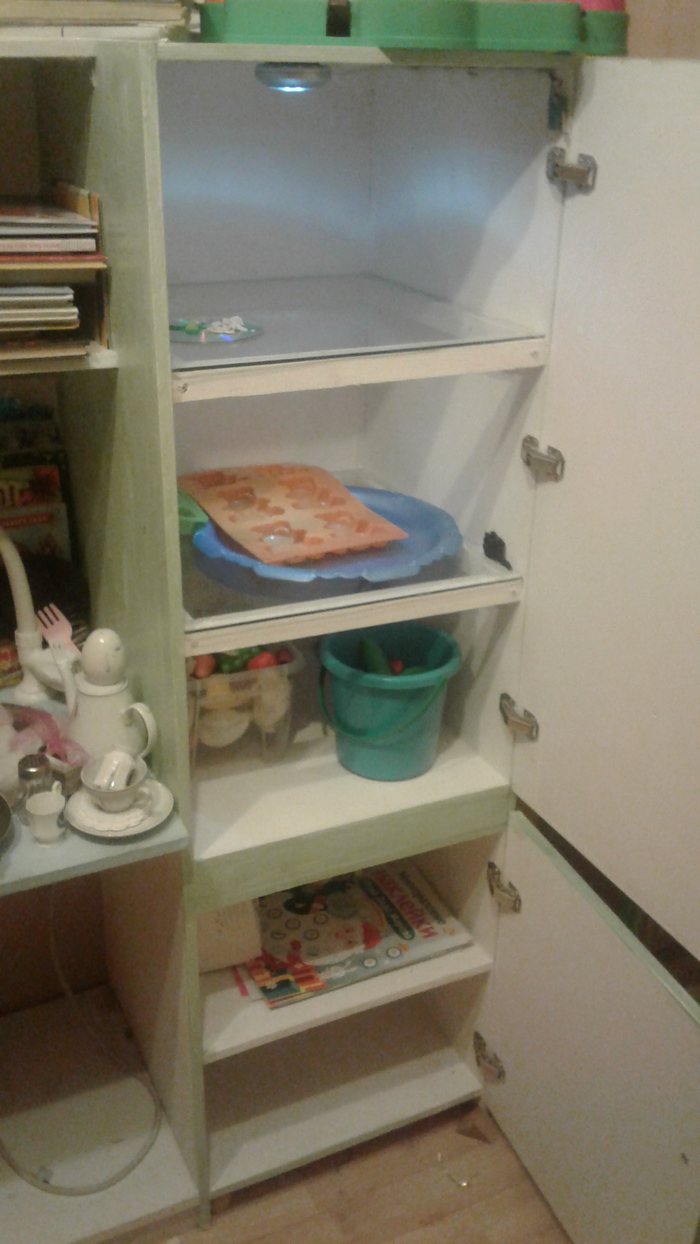 Это холодильник, в нем лежат пластиковые овощи. А ещё это плохо видно но в нем есть подсветка. А под ним есть морозильная камера. Холодильник сделан по образу того что стоит на кухне чтобы у дочери не было лишних вопросов что и зачем.