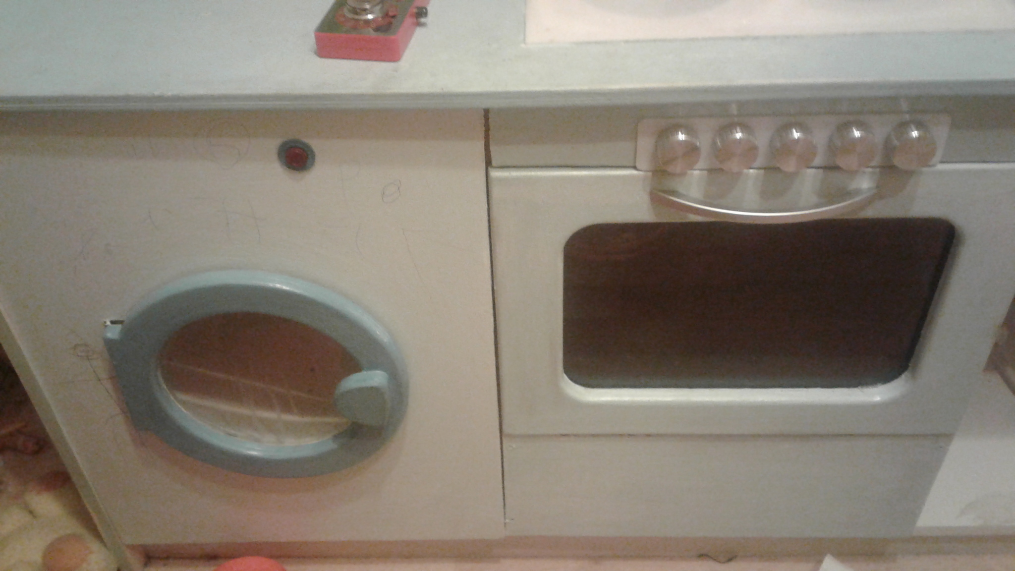 Снизу есть духовка (в которой зажигается свет если повернуть нужную ручку, и стиральная машинка с большим барабаном (кнопка для антуража). Дверка духовки откидывает на фурнитуре от советской стенке которую я снял когдато перед тем чем её выбросить