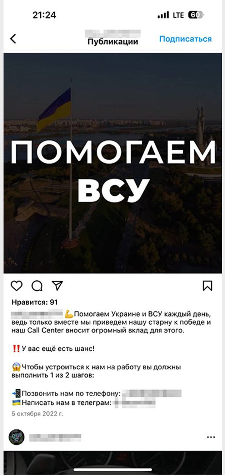 Первым делом Александра решила устроиться в один из трех кол-центров Днепра. Его типичная публикация в соцсетях — это слайд-шоу, в которых снимки разрушенных домов вместе с призывами «помочь своей стране и отомстить» чередуются с обещаниями хорошего и стабильного заработка, причем при минимальных нагрузках.