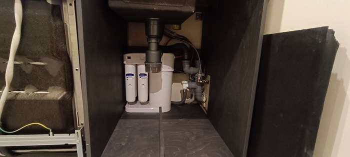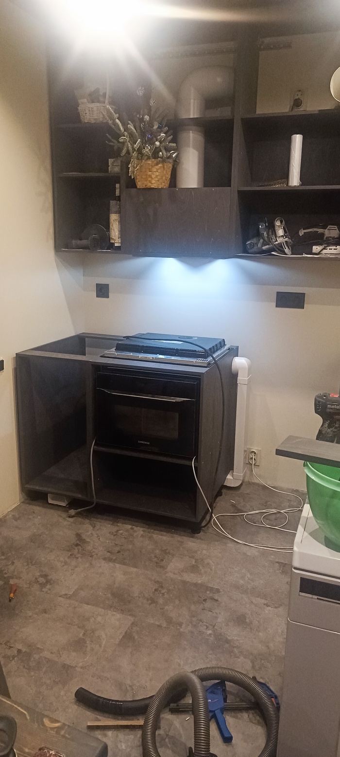 Я купил крутейшую микроволновку с конвекцией, она перекрывает всё потребности типа испечь пирог, запечь мясо и разогреть еду, но она просто огромная и не предназначена для встраивания, так как ветилируется со своей задней стороны. И вот чтоб она хорошо себя чувствовала в шкафу (а заодно и варочная) я сделал им принудительную вентиляцию, которая будет всасывать воздух через щели с лицевой стороны и выбрасывать его в ноги в левой части кухни. Моторчик поставил 90м3/час, должно хватить.