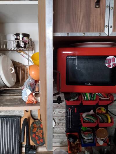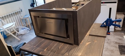 Я купил крутейшую микроволновку с конвекцией, она перекрывает всё потребности типа испечь пирог, запечь мясо и разогреть еду, но она просто огромная и не предназначена для встраивания, так как ветилируется со своей задней стороны. И вот чтоб она хорошо себя чувствовала в шкафу (а заодно и варочная) я сделал им принудительную вентиляцию, которая будет всасывать воздух через щели с лицевой стороны и выбрасывать его в ноги в левой части кухни. Моторчик поставил 90м3/час, должно хватить.