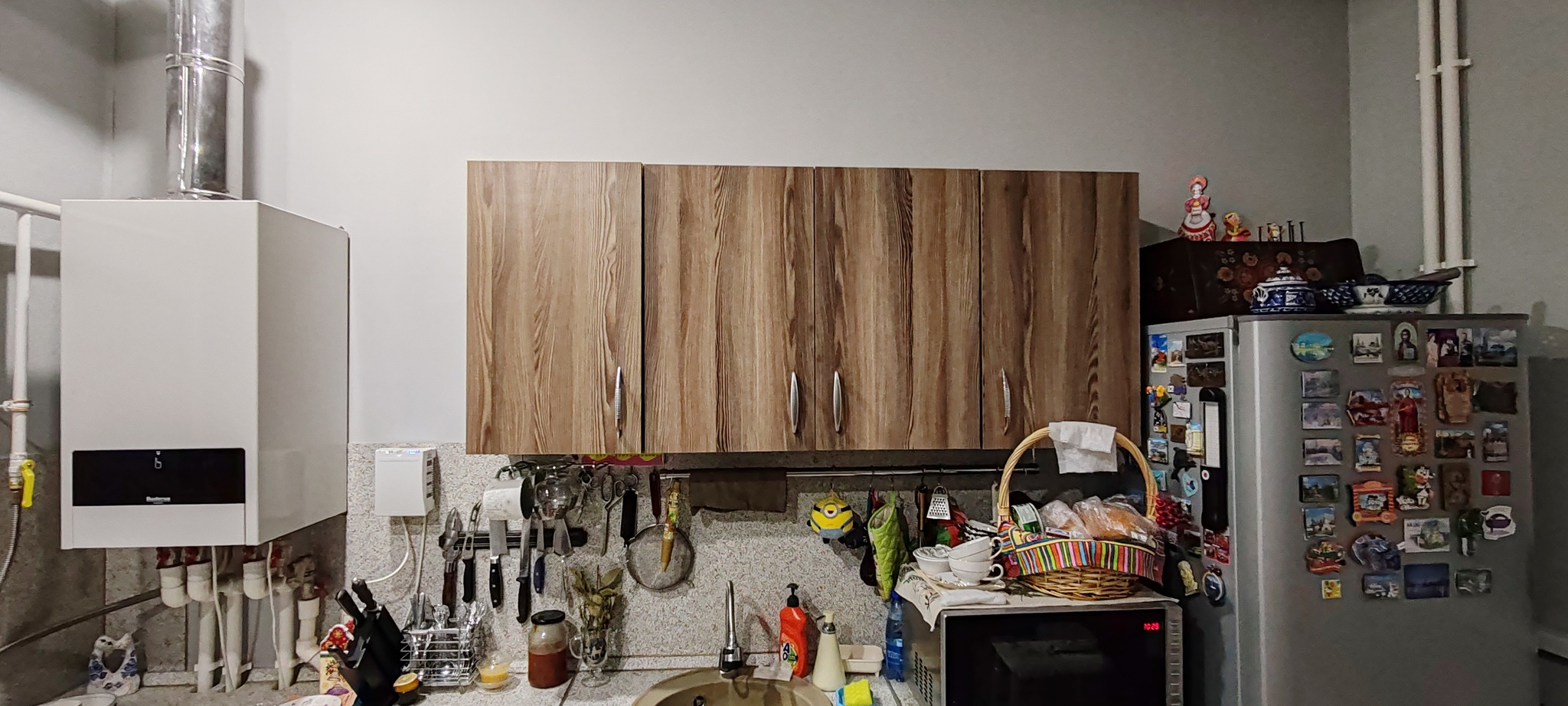 Из всех существующий предложений самым доступным был вариант покупки сборной кухни (стандарт, отсюда и вышеуказанный размер) в Леруа Мерлен. Все дизайнерские штучки-дрючки с гламурными фасадами стоили конских денег (как и сейчас) , и мне, признаюсь, было непонятно, за что такая цена. Не спорю, что есть слово « КРАСИВО», но не всегда то,что выглядит красиво удобно и функционально, поэтому, учитывая наш пустой карман, на изыски не претендовали , и, отказавшись от сборки и установки,я решил что соберу, вырежу и подгоню все сам. Все просчитали , сделала заказ и в назначенный день приехала машина , и я все затащил в дом. Да, что важно, так как доставку делала компания, сразу купили раковину, стеновую панель и всякие недорогие мелочи для дома, типа бельевой корзины, вёдер, швабры, щётки... Мне предстояло в одиночку после работы собрать и установить все шкафы, закрепить панель на стене, выпилить отверстия под мойку и для труб отопления и водоснабжения, да так, чтобы это выглядело достаточно эстетично, ведь это очень важно для хозяйки. Я поставил перед собой цель- один предмет за один день, точнее за вечер, поначалу так и получалось, но потом, когда набил руку, дело пошло быстрее. Говорить о недостатках купленной сборной кухни много не буду, лишь скажу, что можно было исправить в самом начале. Пластмассовые ножки очень слабые и моего веса ( 90 кг) не выдерживали, крепления тоже не ахти, петли надо было сразу покупать с доводчиками, не на все шкафы, но хотя бы на шкаф для посуды, который чаще всего открывается, да и пластмассовые ручки у шкафов ломкие, две уже поменял, дсп снизу , которые закрывают ножки, рассыхаются, ну да ладно, перейдём теперь к позитивному. Первый и самый основной момент- мне удалось все собрать, повесить, подключить воду и слив, привезти жену и сделать торжественный запуск , услышав в ответ фразу, которую я помню до сих пор: « Мы завтра переезжаем, слава Богу...». При всей бюджетности, столешницы оказались достаточно крепкими, врезал в них варочную панель, раковину- все держит , работает.На фото вы видите духовку, шкаф для неё я сделал сам и тут уже использовал нормальные ( крепкие) ножки. В общем, скажу, что немного помучился, но победил, и вот уже седьмой год мы активно используем нашу бюджетную кухню.
