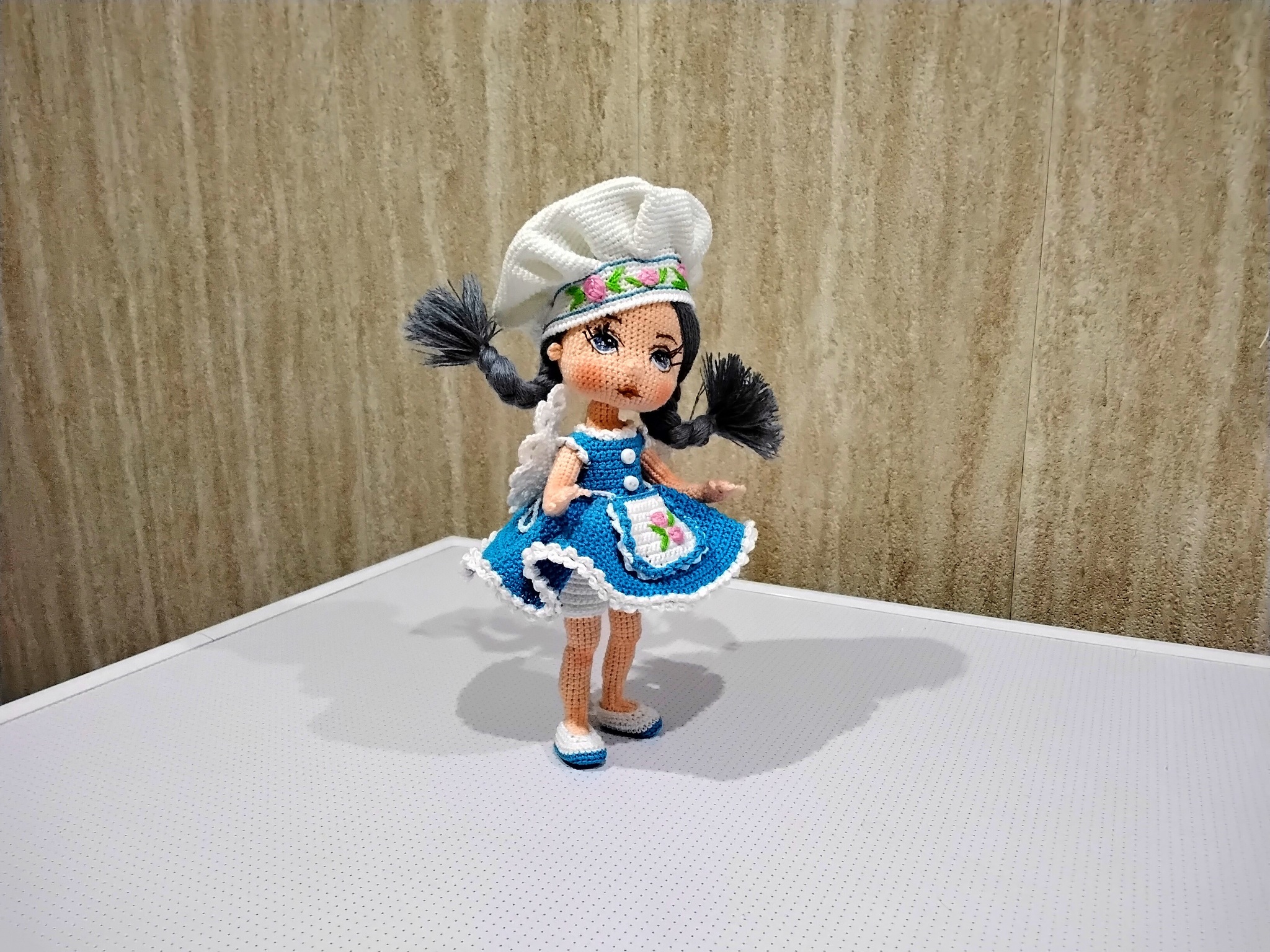 Здравствуйте, после большого перерыва спешу показать вам мою новую коллекционную куколку. Куколка ростом 18 см, связана крючком 0,7, пряжа пехорка хлопок, глазки вышиты, вышивала первый раз такие глазки, волосы мулине. Одежда снимается. Куколка связана по мастер классу oksana_somati