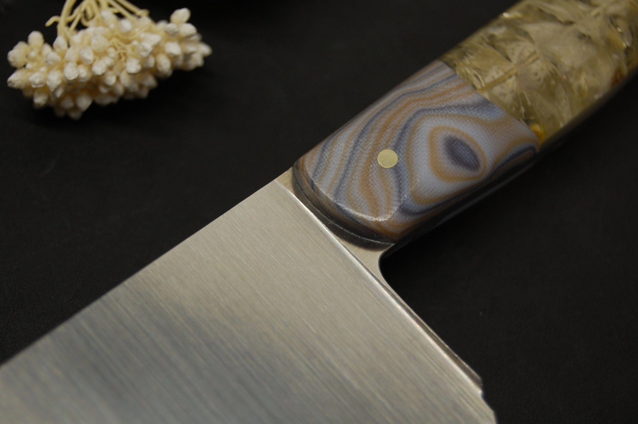 Нож выполнен из нержавеющей стали AUS10co 2 мм толщиной. Шлифованное рикассо в продольный сатин. Спуски от обуха, прямые. Сведение 0,1-0,2 мм. Рукоять из микарты, акрила и гибрида с сухими цветами. Латунный пин 3 мм.