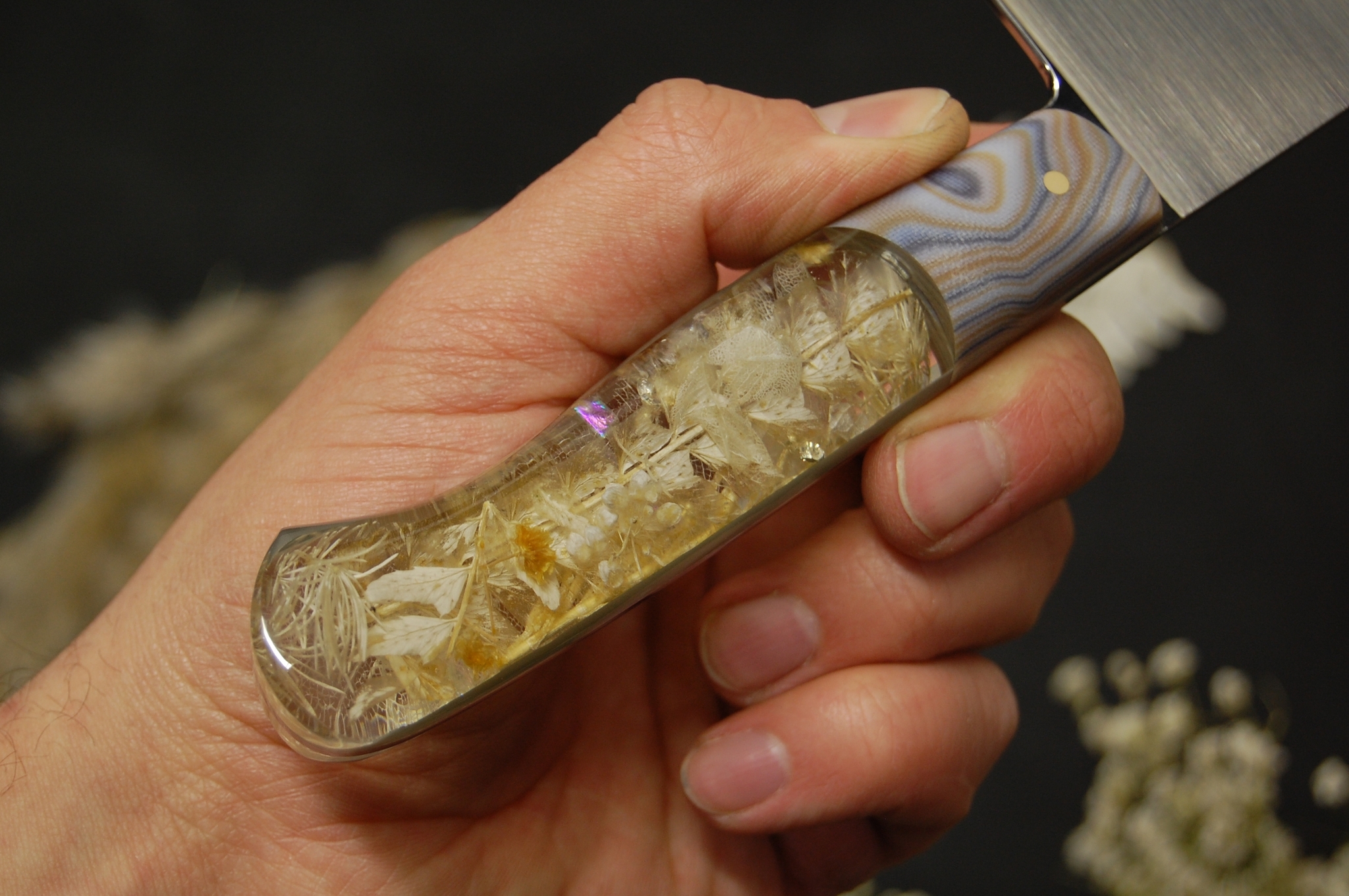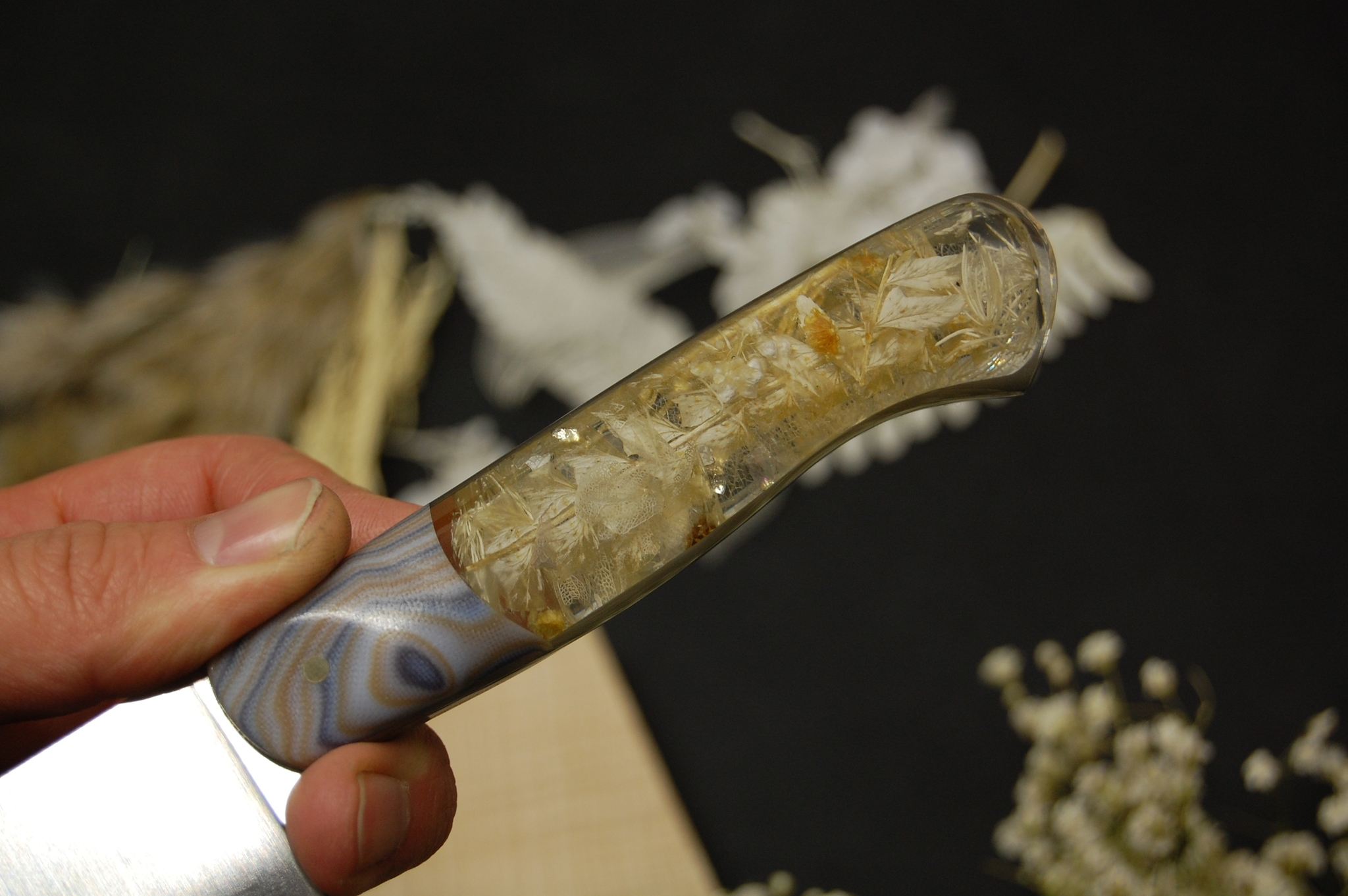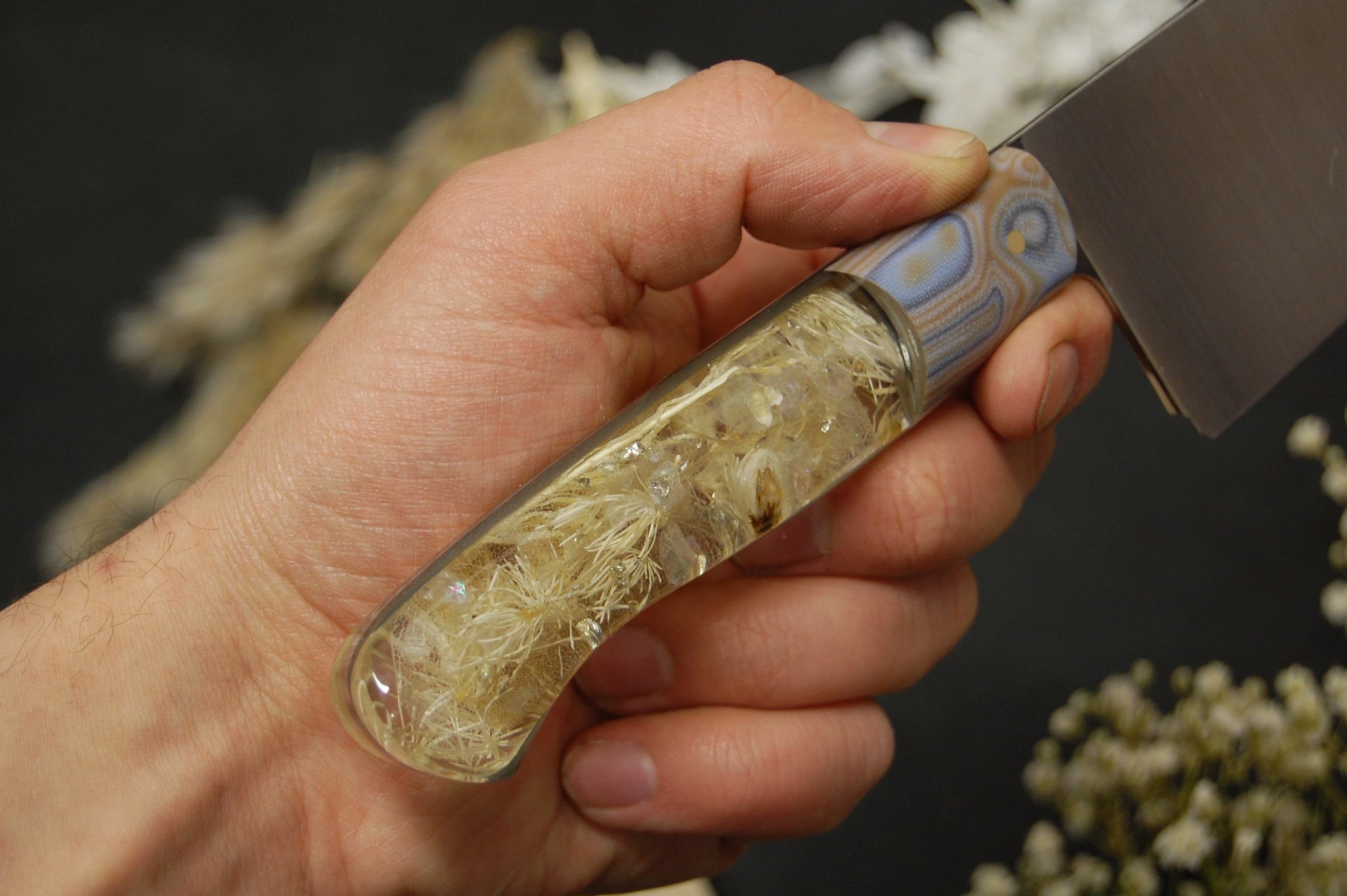 Самое сложное здесь это рукоять. Сборка по системе рамного саркофага. Конструкция фултанг. Рукоять скелетная с большой выборкой отверстием, в которое вставлен гибрид из акрила и сухих цветов белого оттенка. После гибрид залит монолитным слоем акрила. Это необходимо что бы исключить доступ воздуха и воды к внутренней части. Предотвратит растрескивание и последующее разрушение.