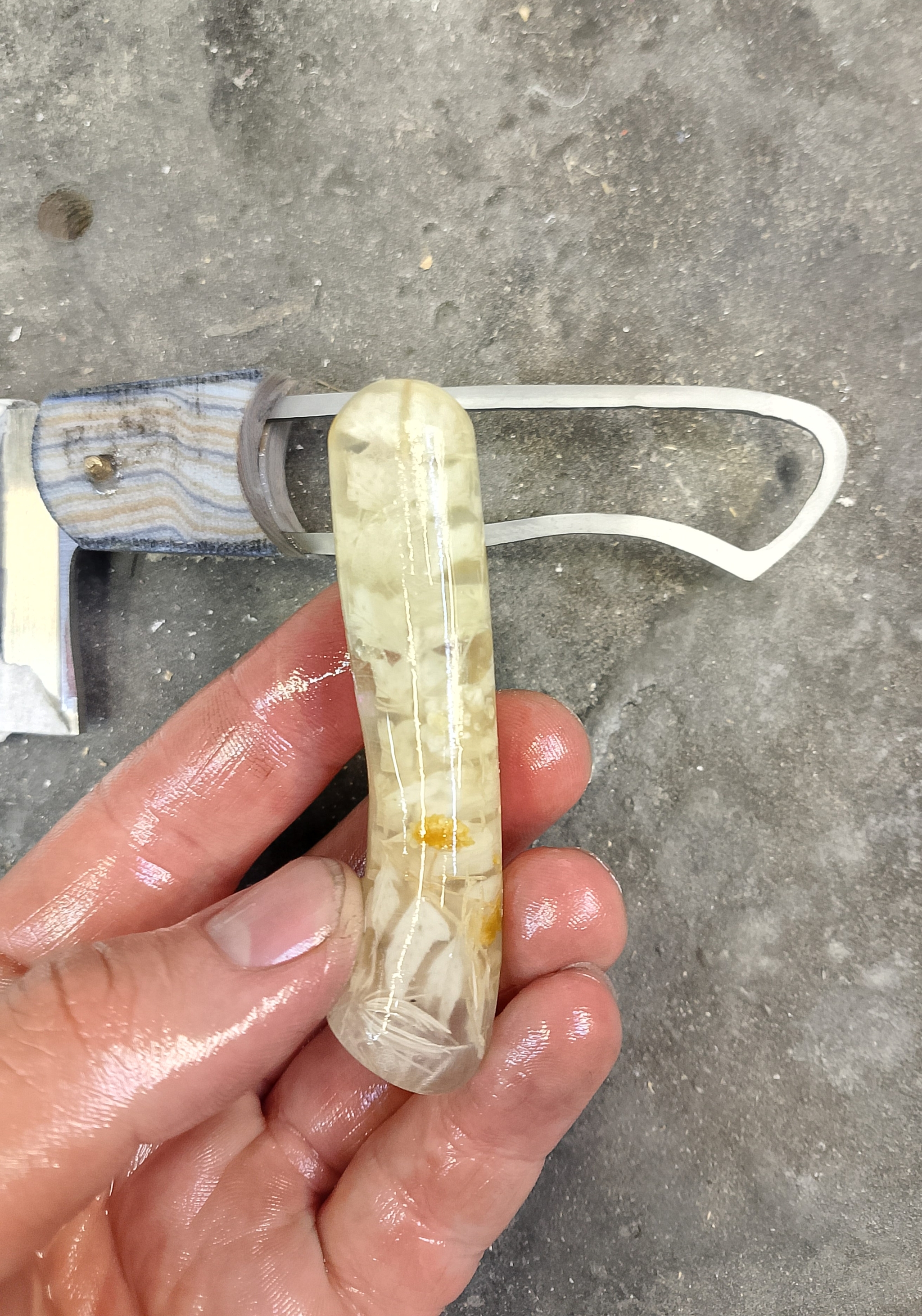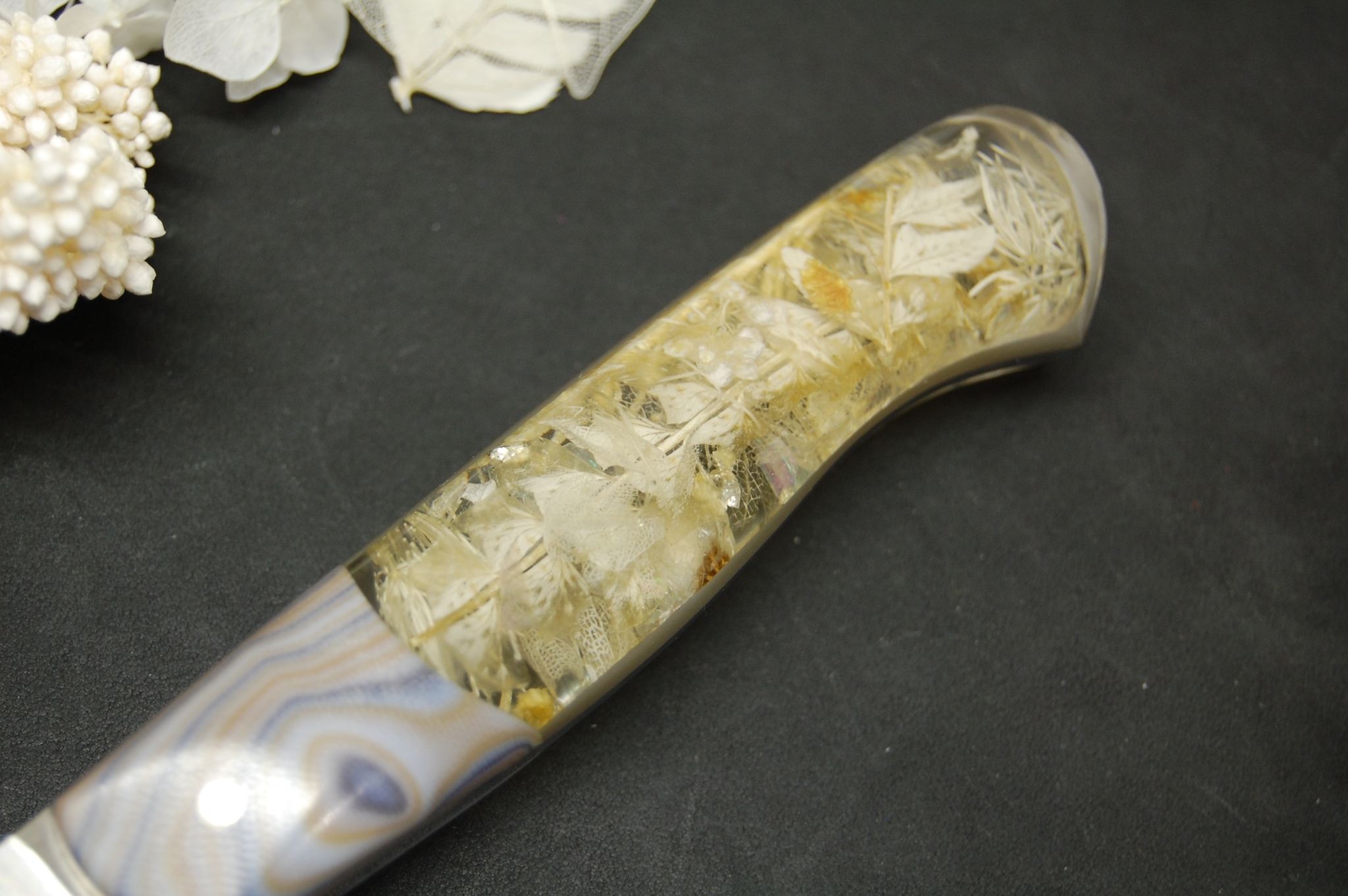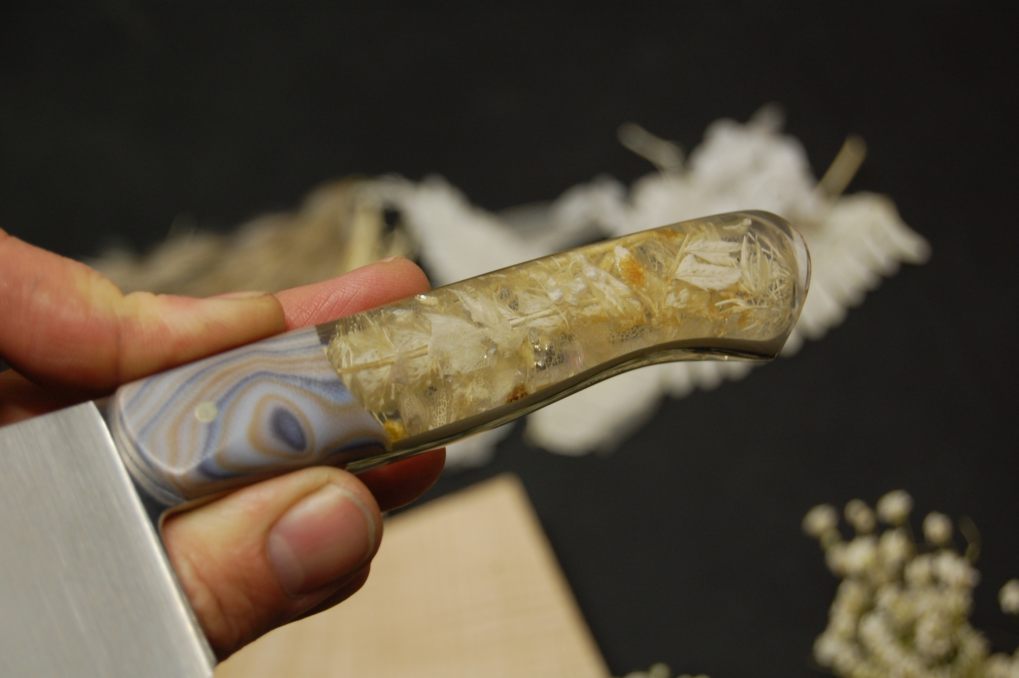 Самое сложное здесь это рукоять. Сборка по системе рамного саркофага. Конструкция фултанг. Рукоять скелетная с большой выборкой отверстием, в которое вставлен гибрид из акрила и сухих цветов белого оттенка. После гибрид залит монолитным слоем акрила. Это необходимо что бы исключить доступ воздуха и воды к внутренней части. Предотвратит растрескивание и последующее разрушение.