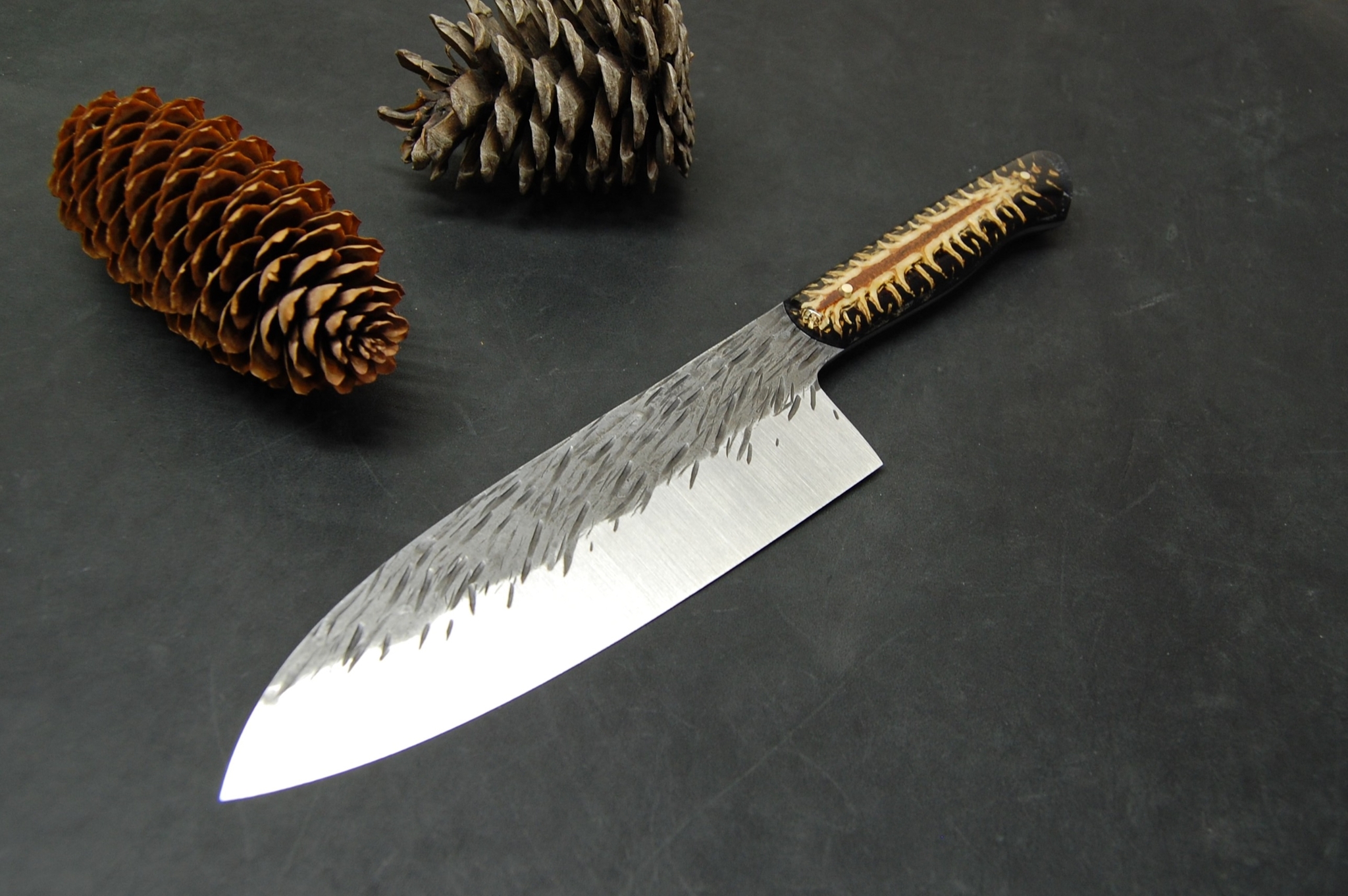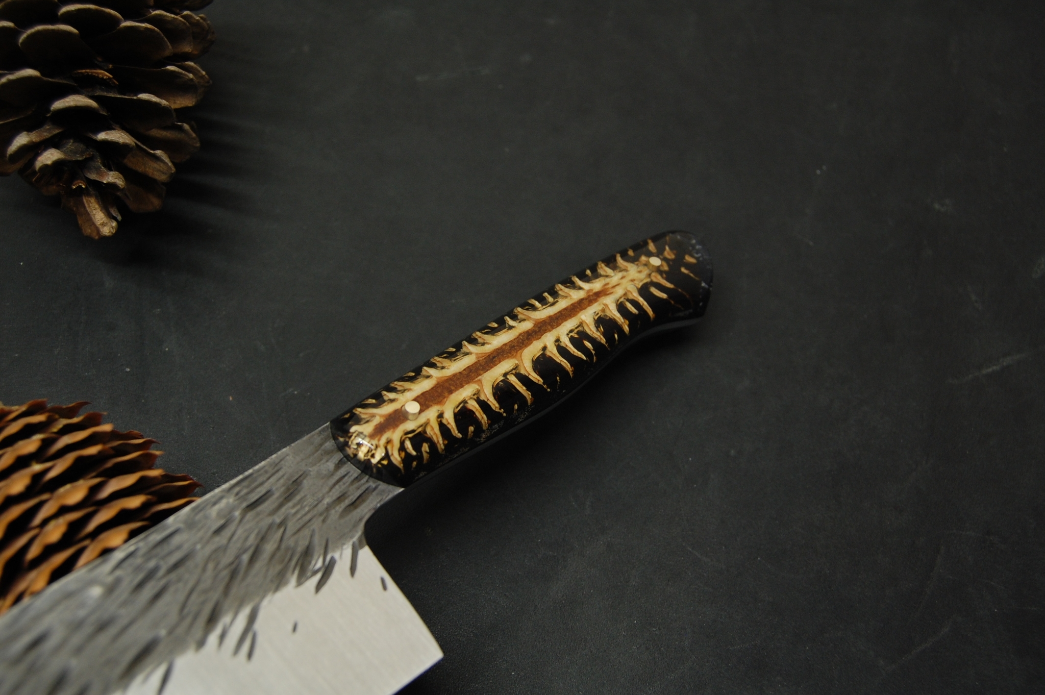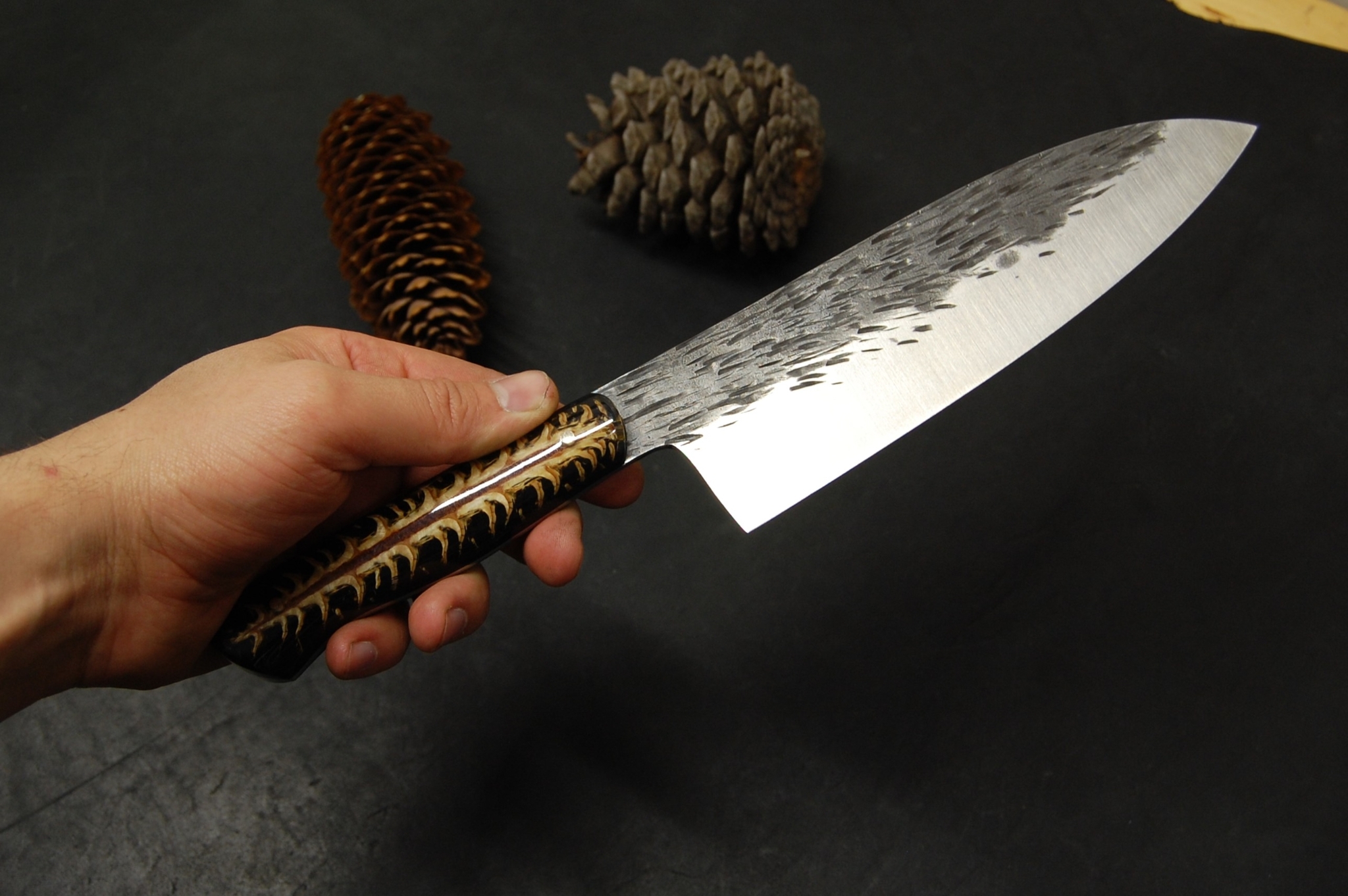 Недавняя работа - нож под кухонные задачи с рукоятью из еловой шишки. Ну почти из еловой шишки)