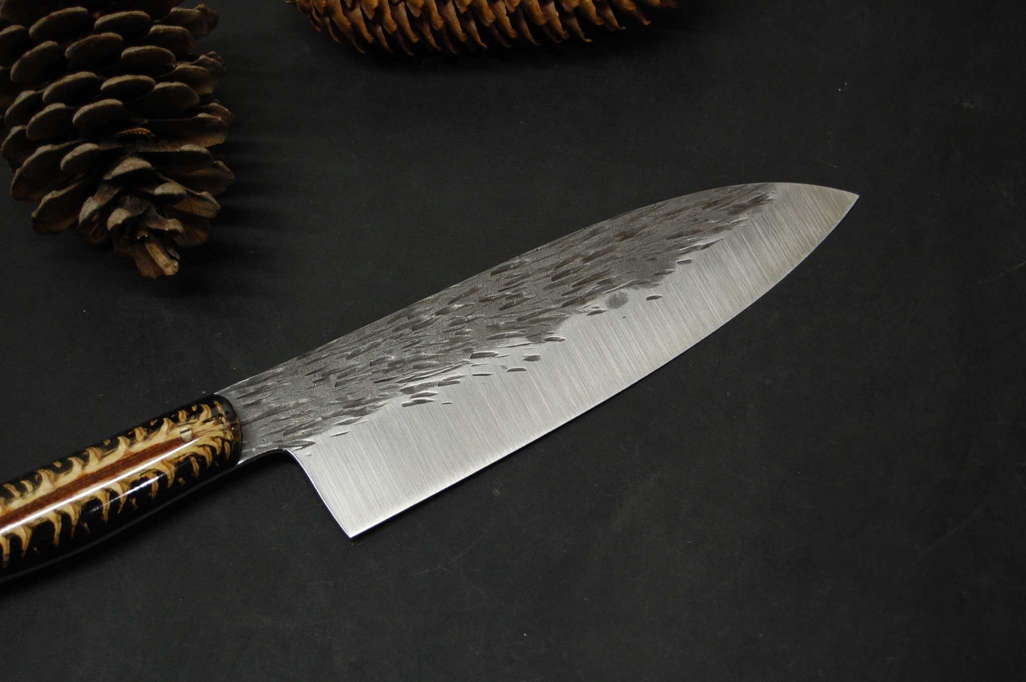 Нож сделан из нержавеющей стали AUS10co, 2,5 мм толщиной. На голомени клинка нанесены следы ковки для антуражного и необычного внешнего вида. Спуски прямые, в половину клинка. Сведение 0,1 - 0,2 мм.