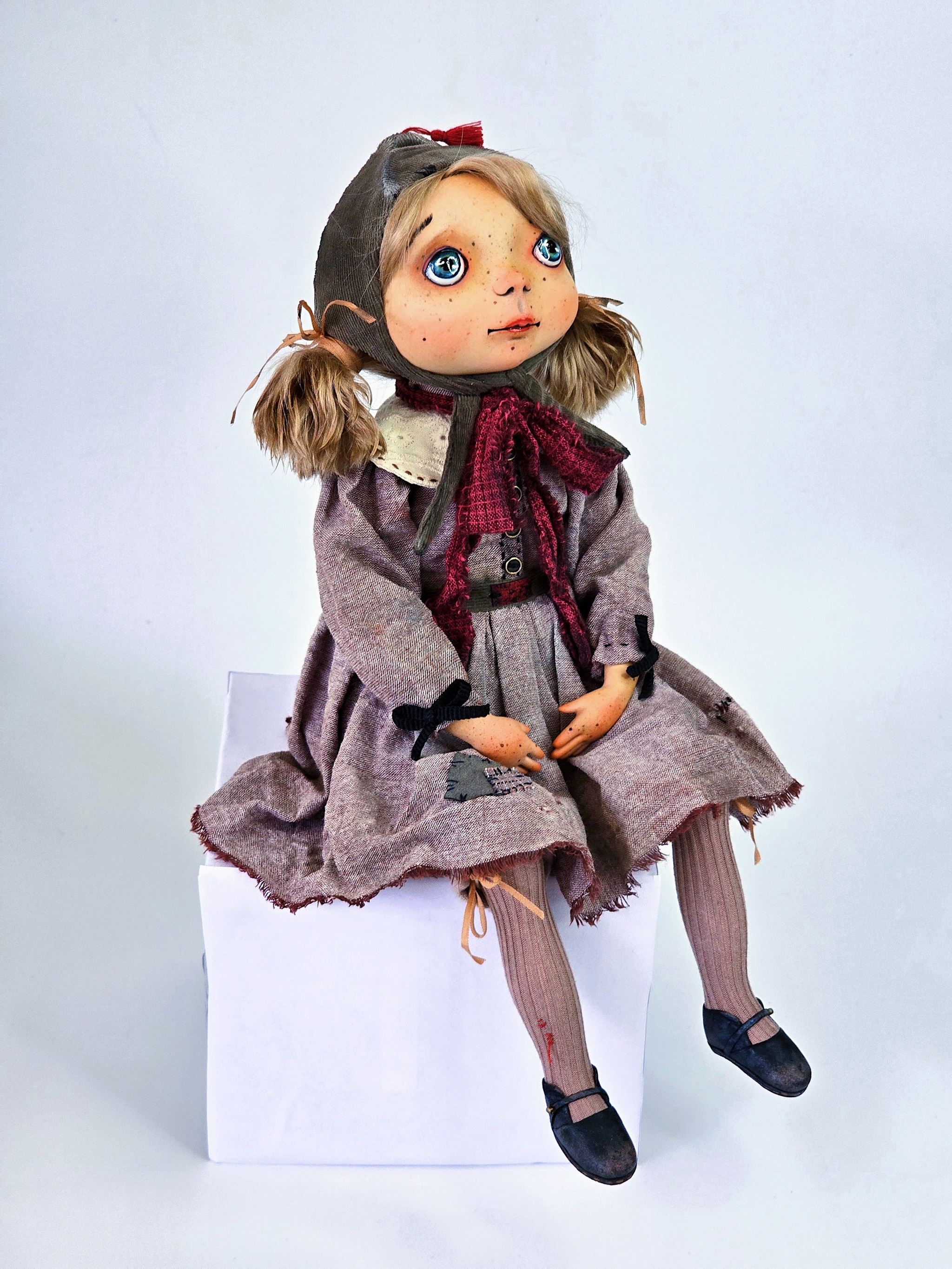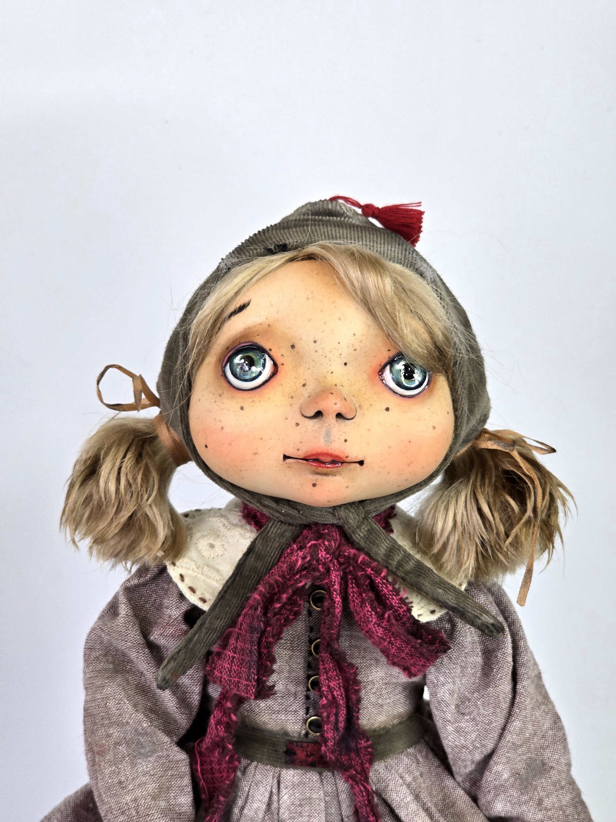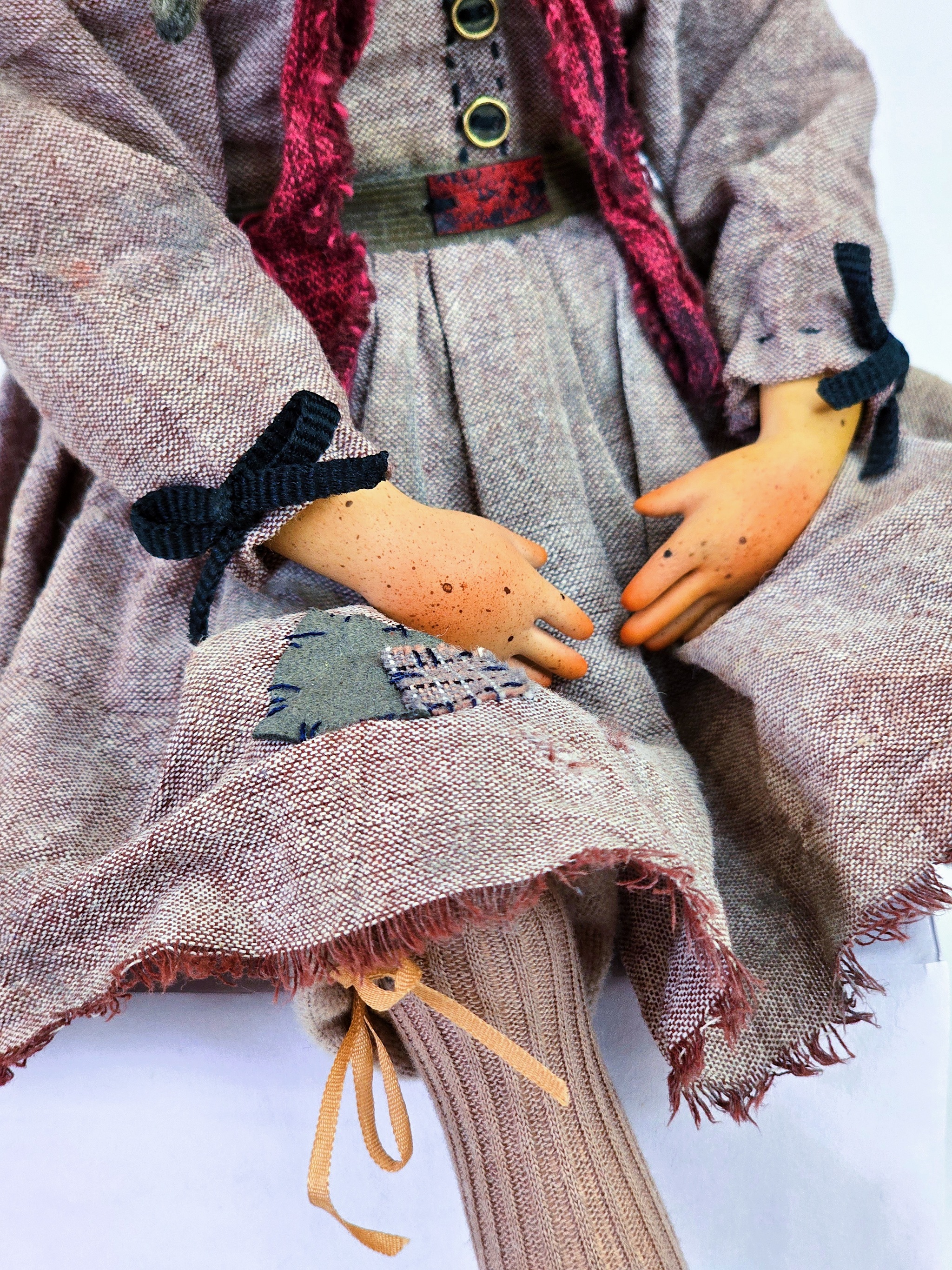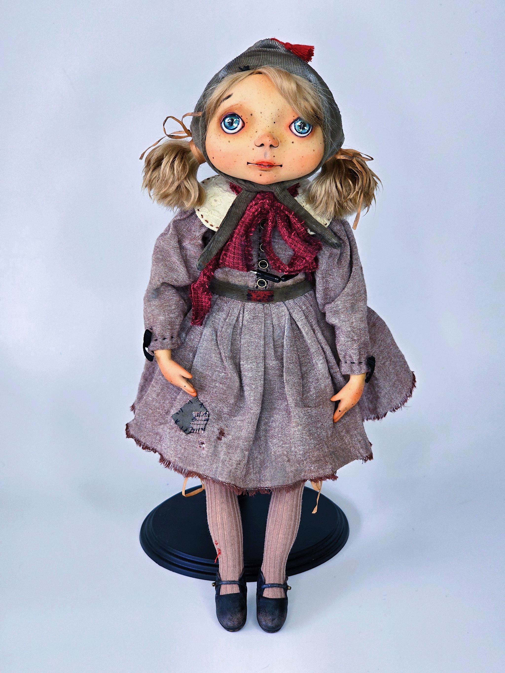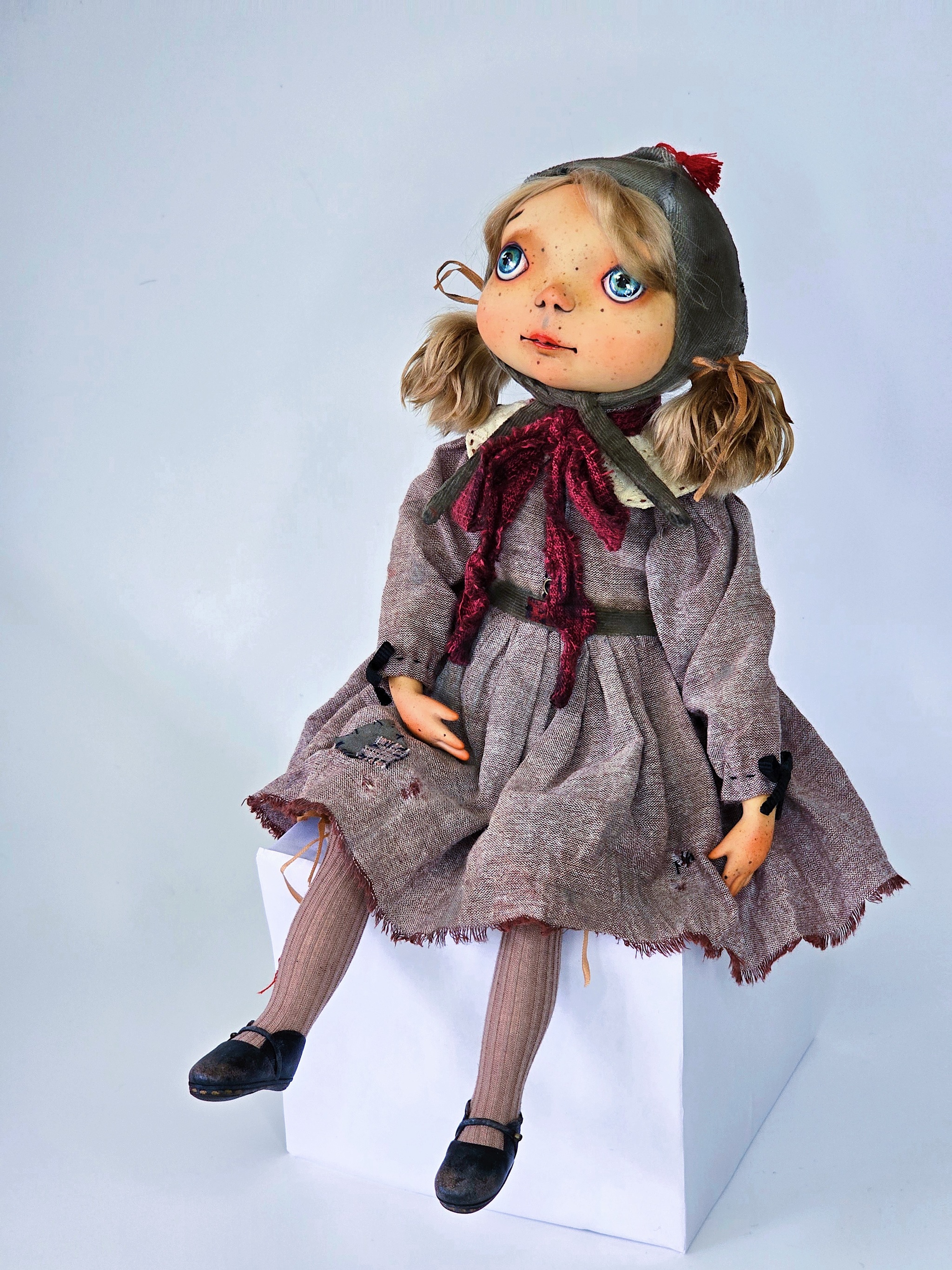 Знакомьтесь: Куколка Манюня — девочка с характером. Будто сошла со старых, выцветших фотографий из 60-х. Поношенные, местами затёртые сандалики, штопаные чулочки, платьице с заплатками и потёртыми краешками, чуть растрёпанные волосы, спрятанные под чепчиком, и игривые хвостики по бокам — всё в ней дышит духом настоящего, озорного детства.