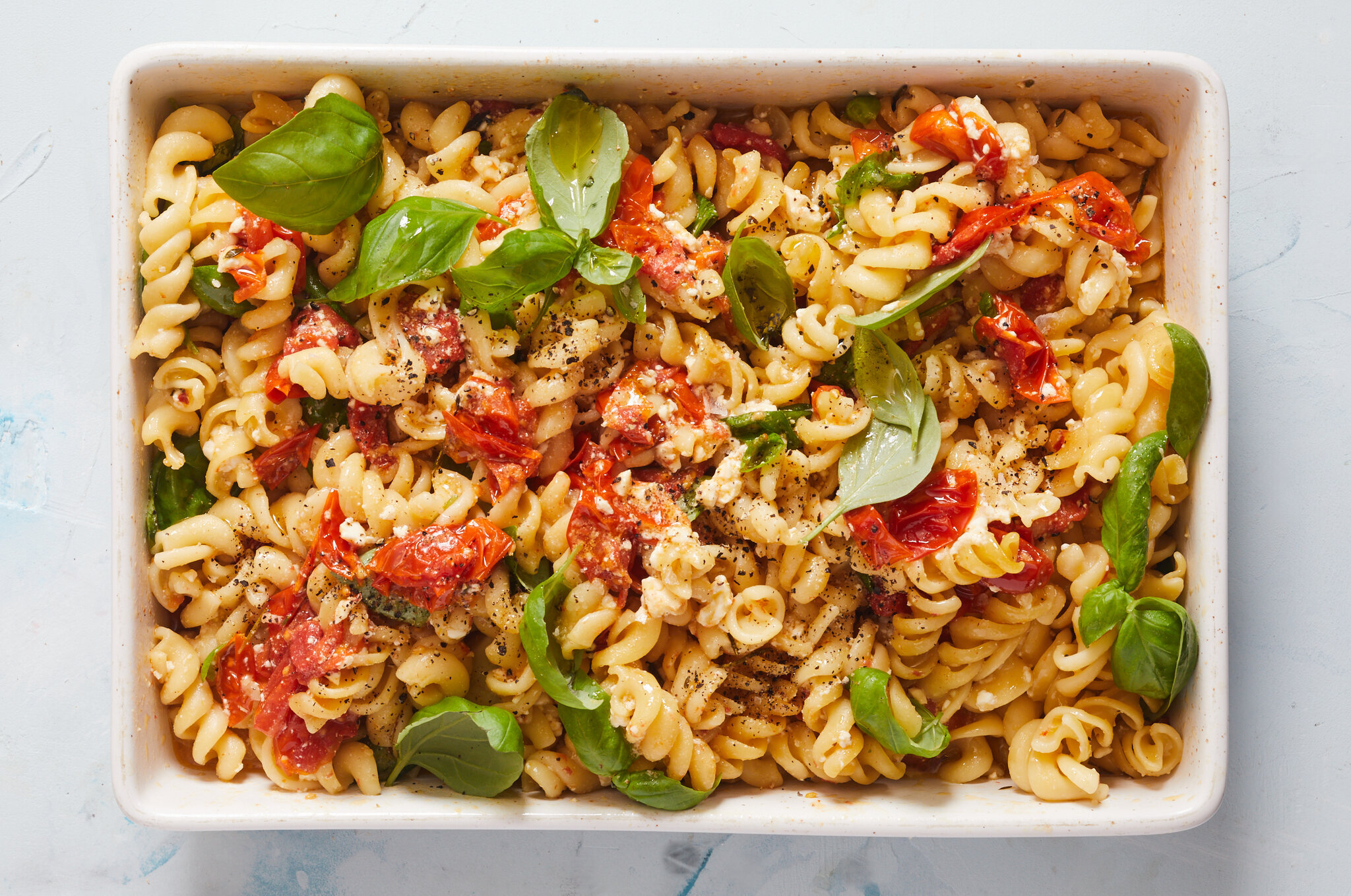 Запеченная фета с томатами превращается в кремовый соус, создавая простое, но вкусное блюдо.