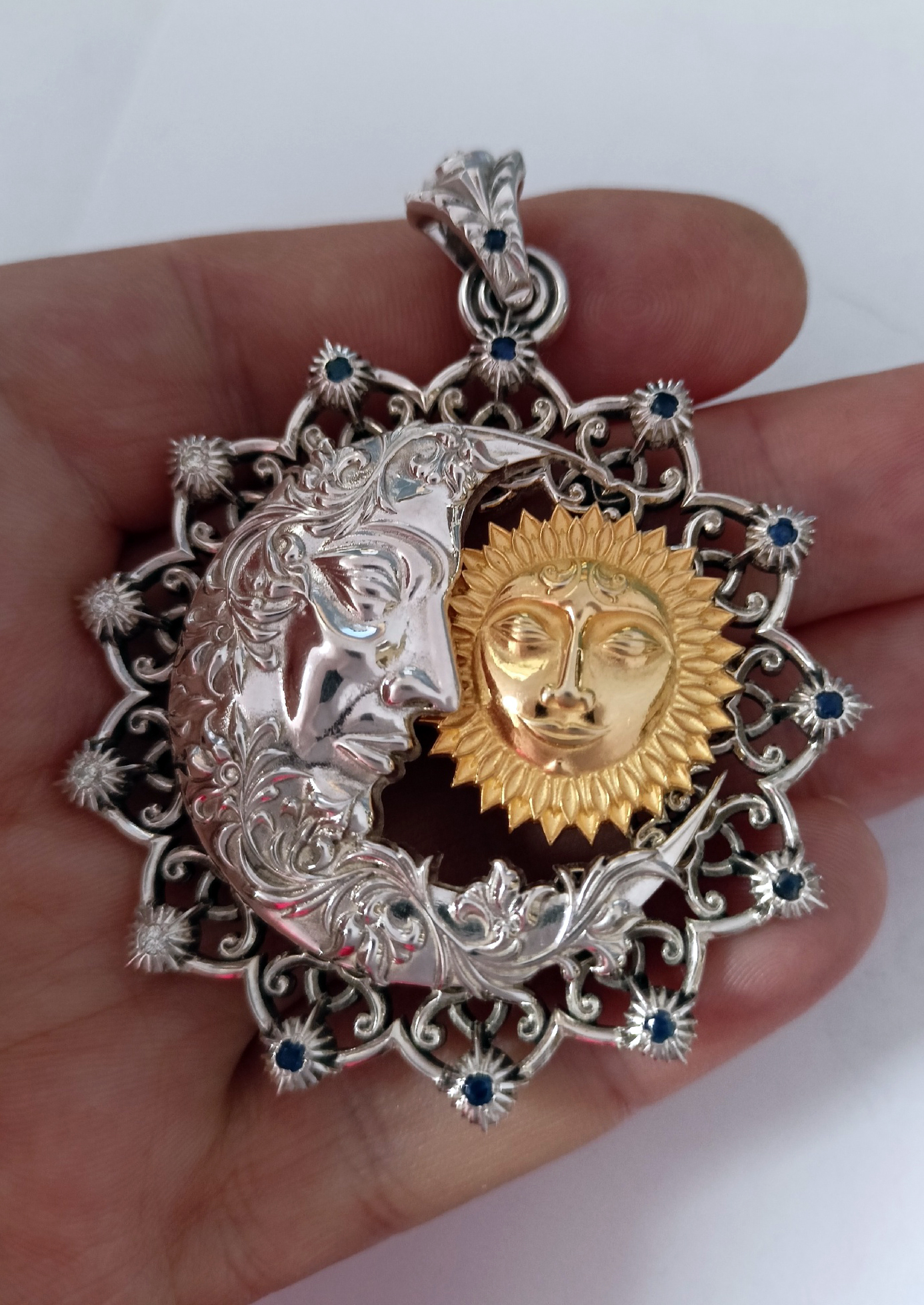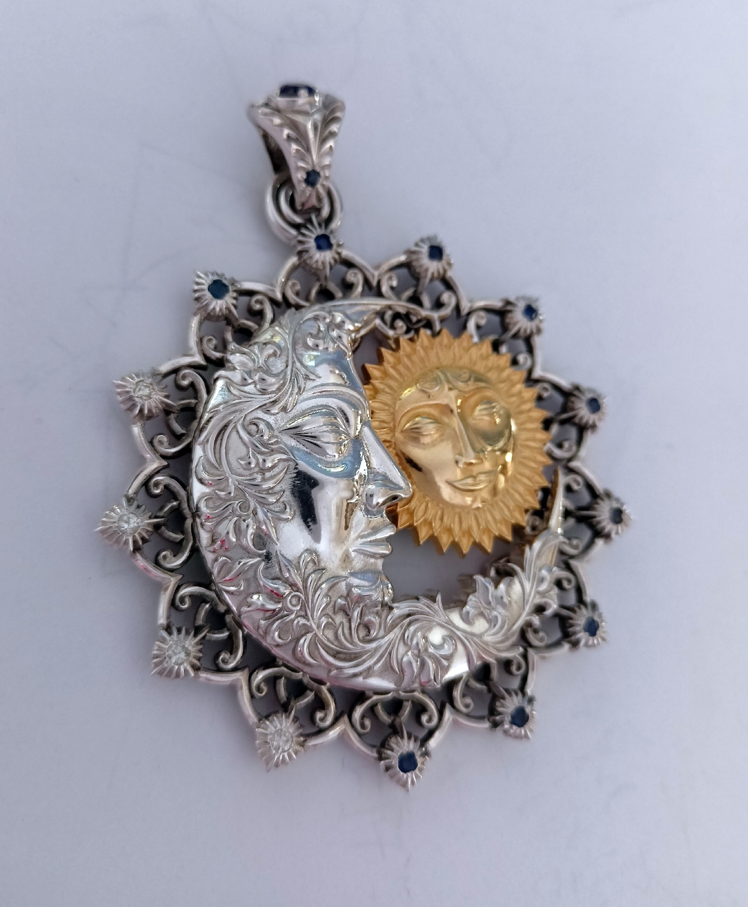 Здравствуйте . Закончил очередной проект Кулон Луна и Солнце . Видео и Фото . Материал Серебро 950 пробы . Позолота . Камни Сапфиры и Бриллианты . Размер 55 мм без учёта ушка . Вес 60 грамм .