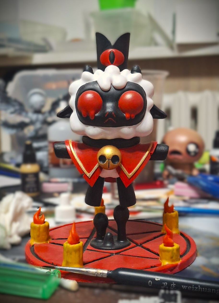 Люблю я рогалики, в смысле игрульки в стиле roguelike, Сult of the lamb одна из таких прекрасных игорь. Когда я сделал в этой игре все что можно было сделать, мне пришла идея устроить культ агнца на своей полке с фигурками. Засучив рукава и засучив руками по клавиатуре, я породил своего комнатного идола.